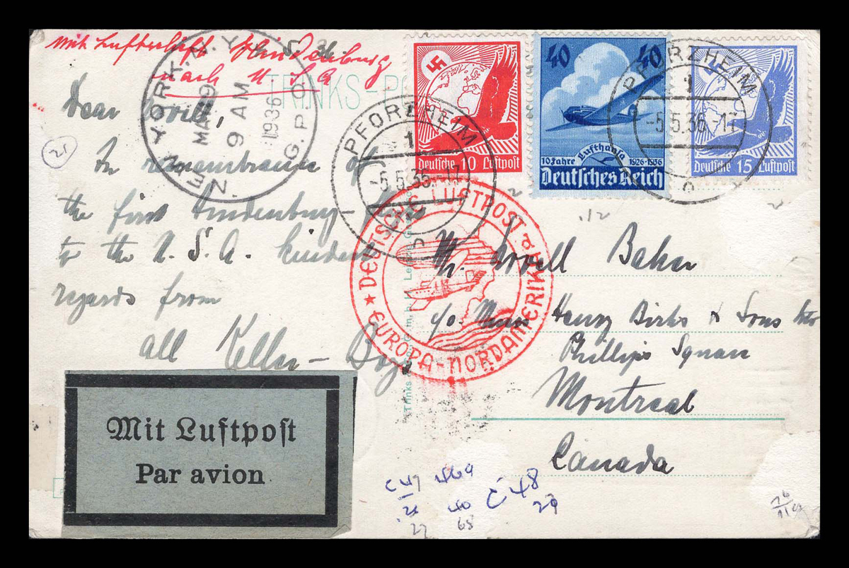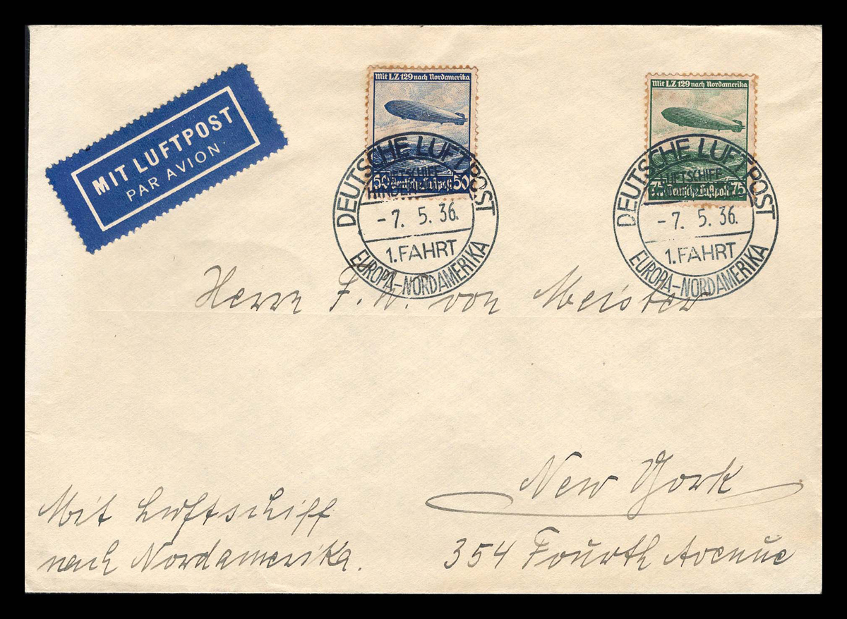 and 2 Covers from the Friedrichshafen-Lakehurst Hindenburg Flight, all mailed between MAY.1 and MAY.6 to either Canada or the United States, all have the red Europe to North America flight cachet and New York receivers. Two are registered and we