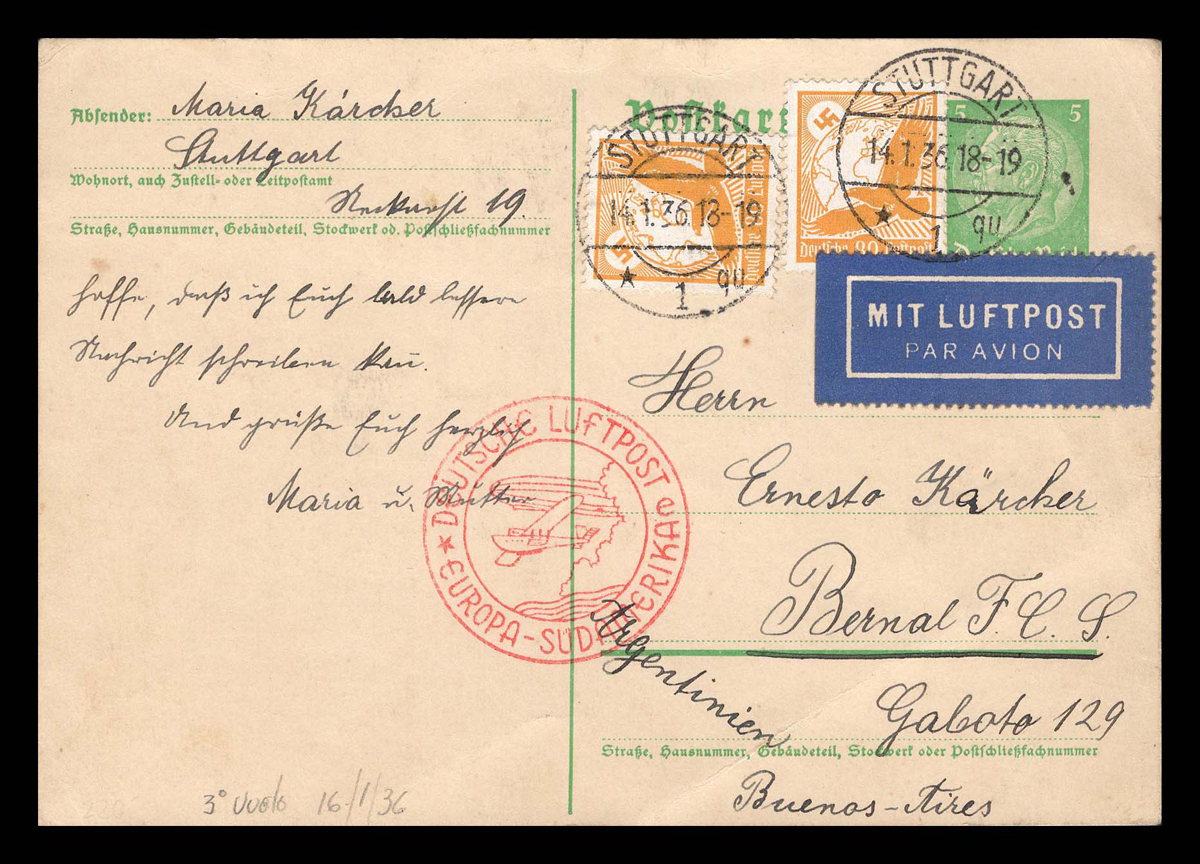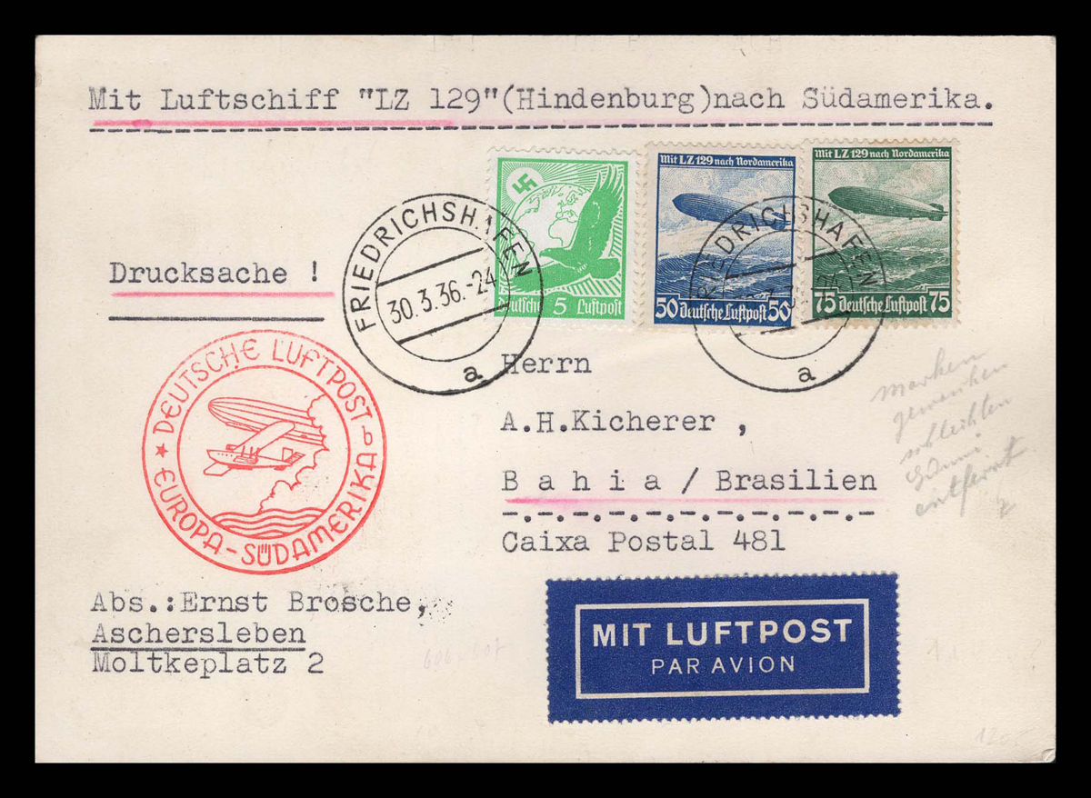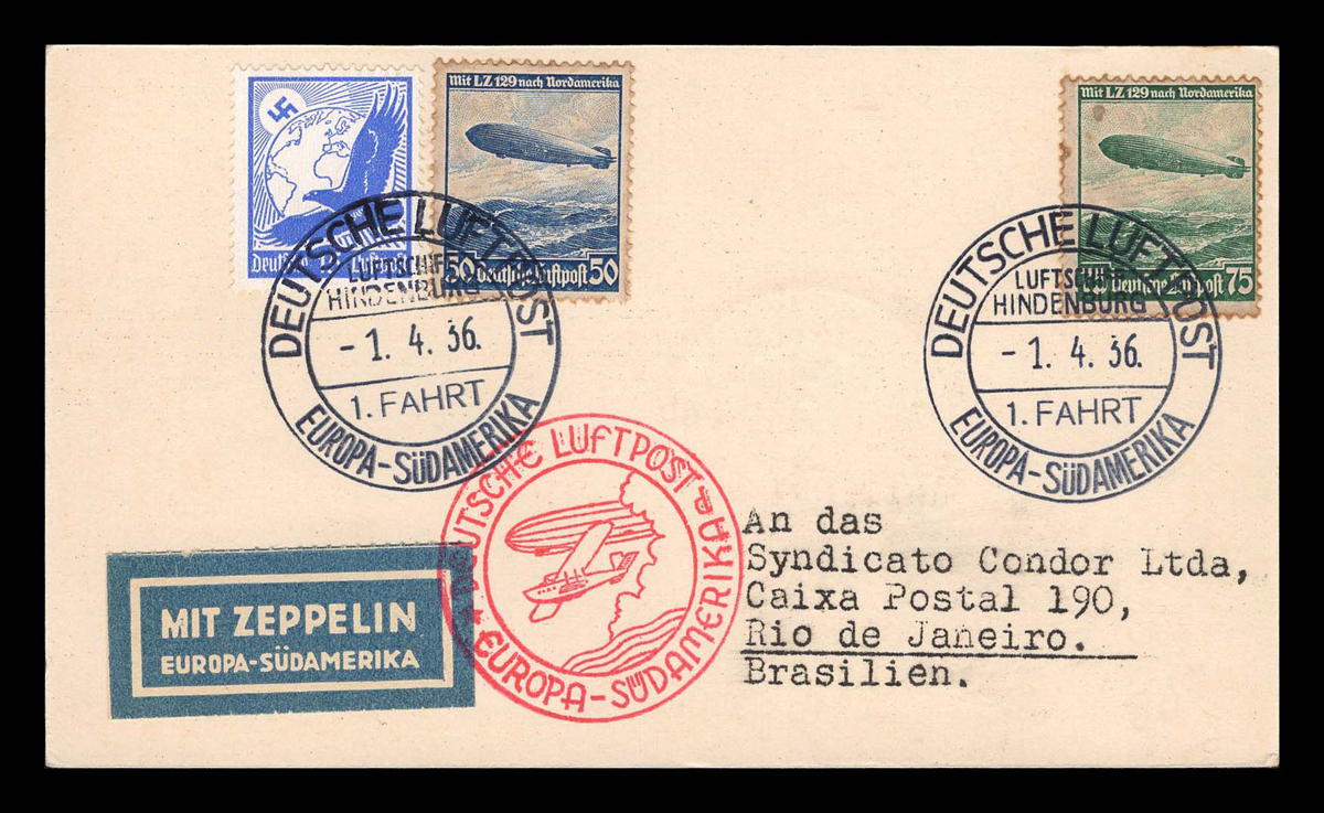 Zeppelin and Hindenburg Flown Covers, in chronological order, with JAN.14 Europe to South America Zeppelin card to Argentina, MAR.30 Europe to South America Hindenburg card to Brazil, APR.1 Europe to South America Hindenburg card to Brazil (ex