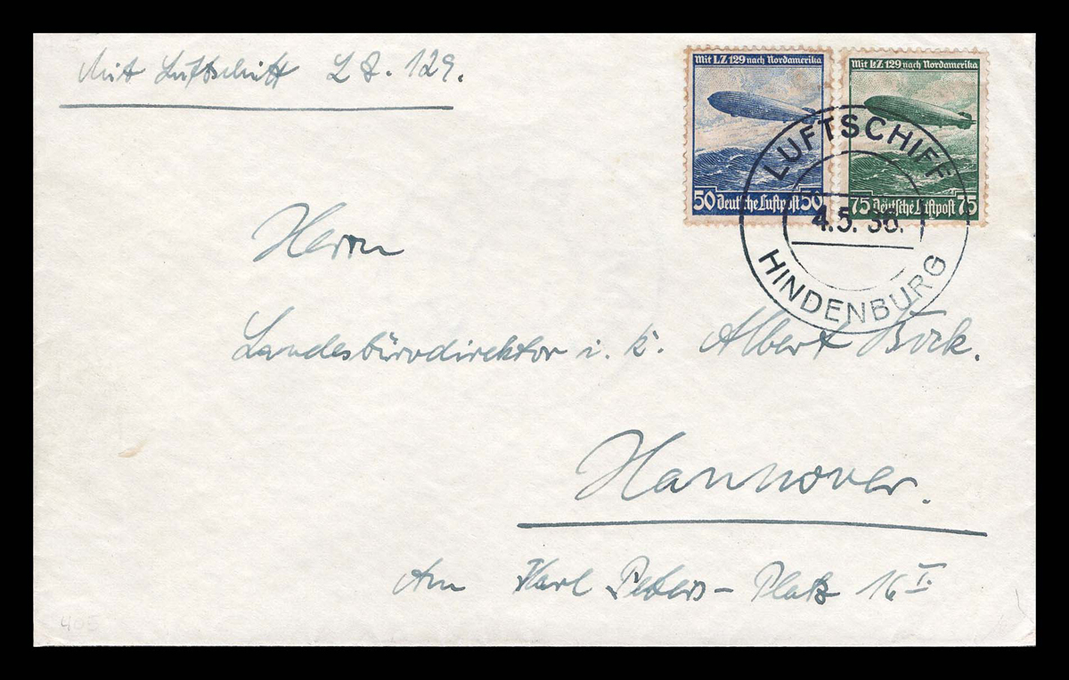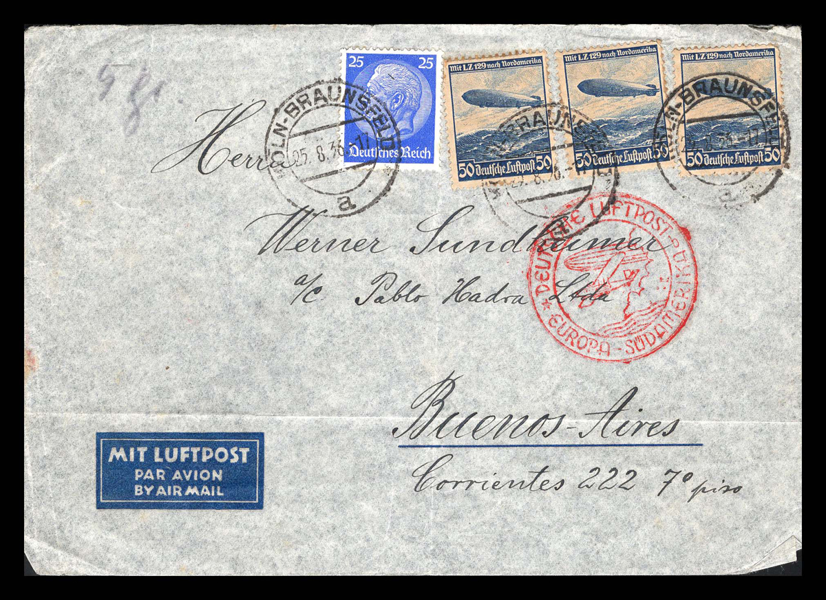 Sieger), MAY.1 Europe to North America Hindenburg large cover to United States (small tape stains), MAY.4 Hindenburg cover to Germany, MAY.7 flight cover to United States, and AUG.25 Europe to South America Hindenburg cover to Argentina (vertical