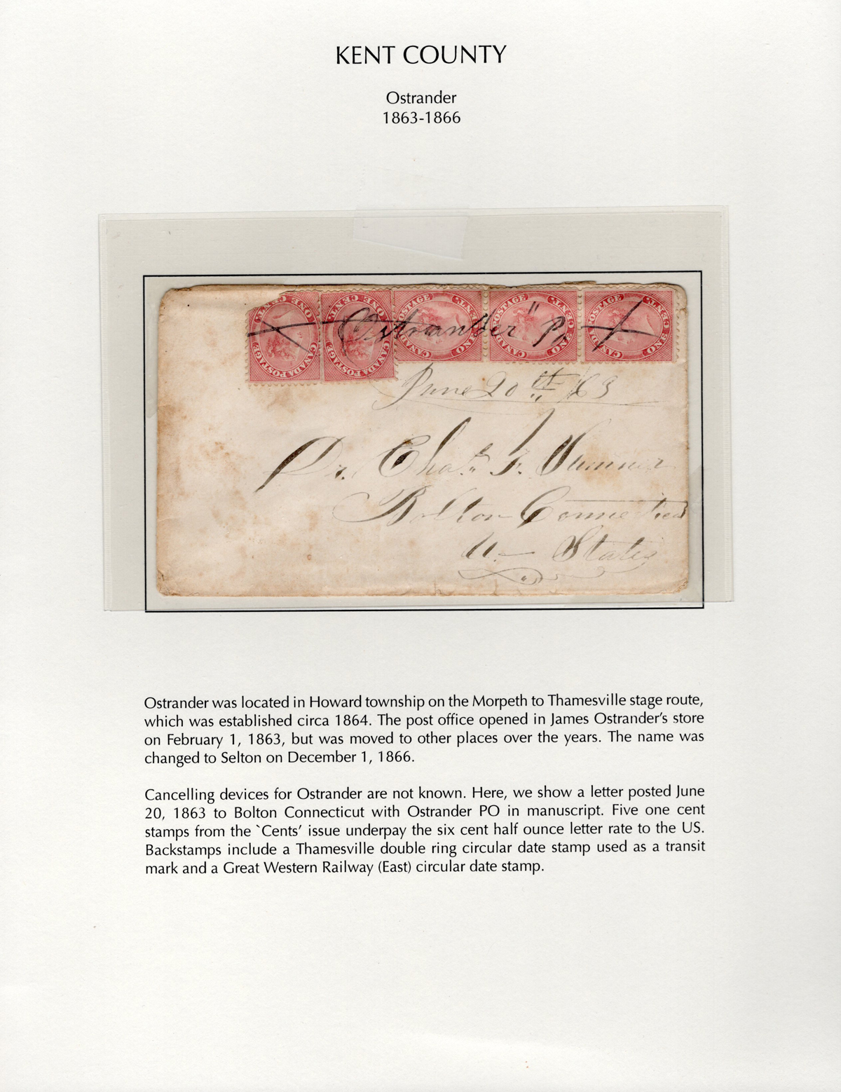 backstamps, one a partial G.W.R. datestamp and the other a partial Thamesville transit. The Ostrander post office never had postmarking devices, as it was only open from 1863 to 1866 and even moved around during that short period. Cover has foxing