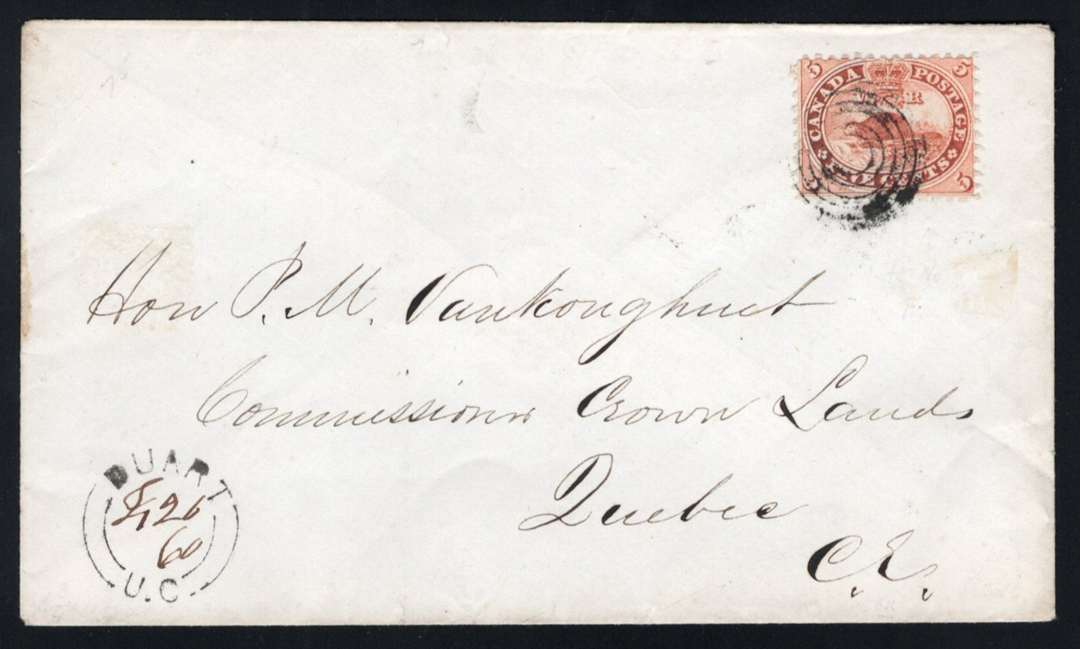 from Duart U.C, mailed on FEB.20.1860 (very fine strike of the scarce small double broken circle, and the earliest recorded strike) to Québec City (FEB.24 receiver) through Clearville (FEB.21) and St Thomas (FEB.22). The cover is franked with a