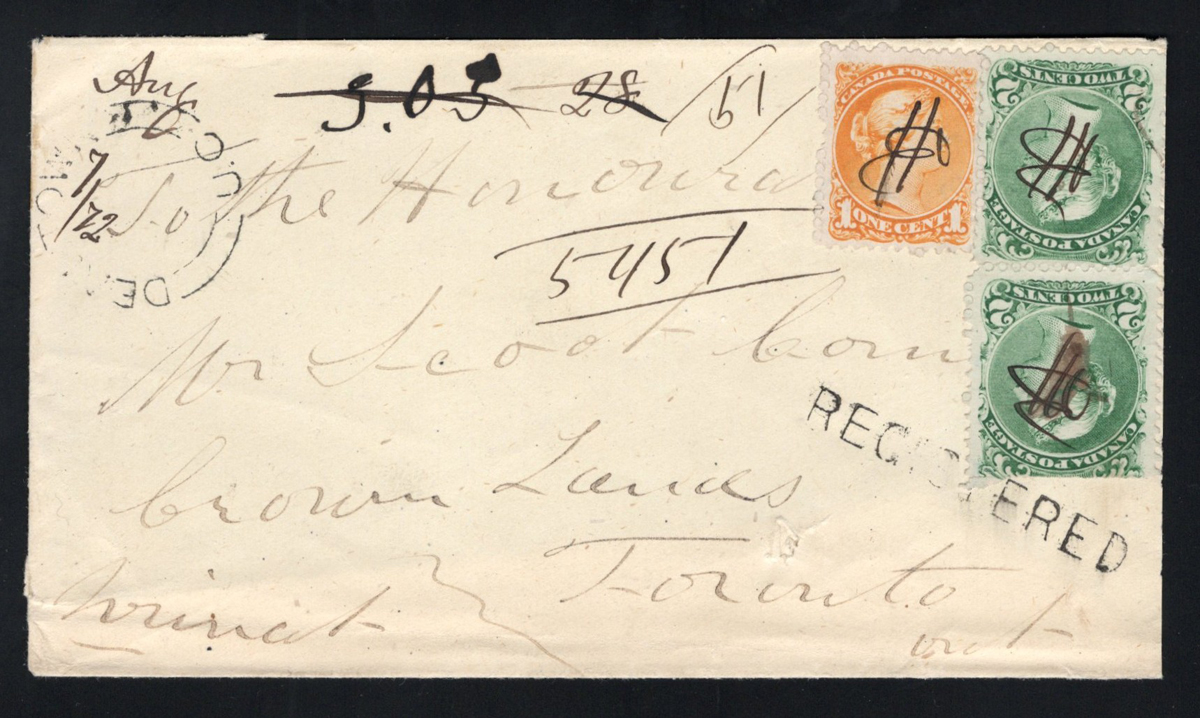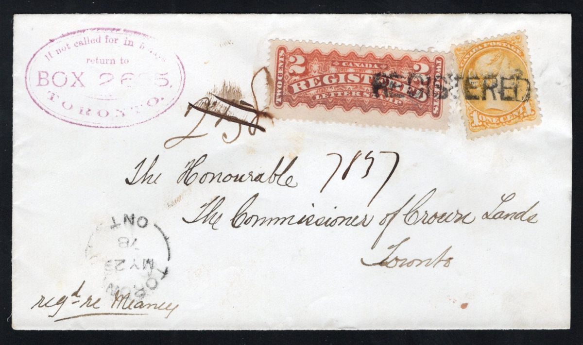 Drop Letter Cover, mailed to and from Toronto on MAY.28.1878 (next day receiver on back), franked with a 1c Small Queen paying the drop letter rate, plus a 2c Registration stamp paying that fee, both cancelled and tied by a REGISTERED