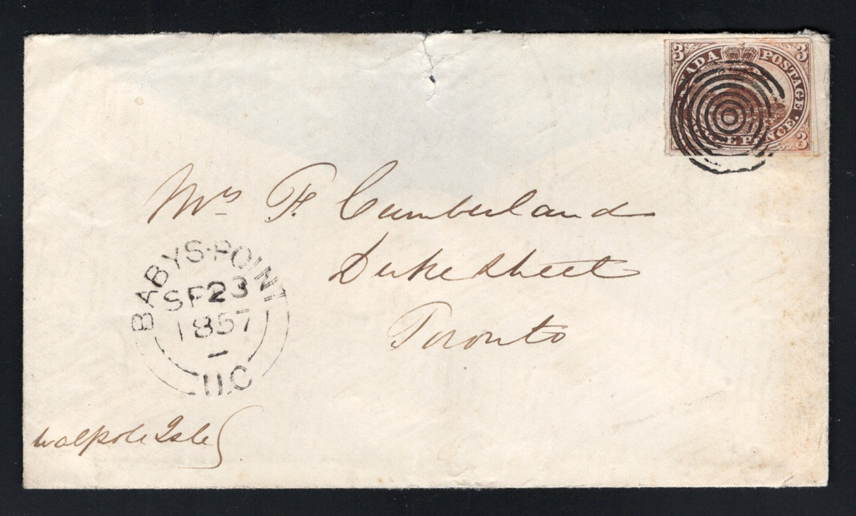 from Babys Point U.C, mailed on SP.23.1857 (very fine strike of their double broken circle) with "Walpole Isle" manuscript notation, to Toronto (SEP.25) receiver on back, franked with a 4 margin 3d red Beaver imperforate, tied by a concentric