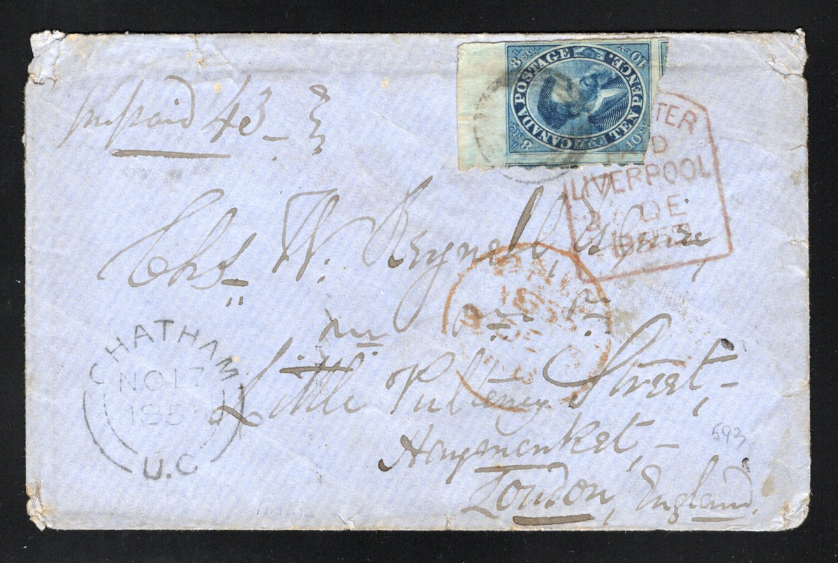 Imperforate on Cover to England, a blue envelope (with large crown watermark) mailed from Chatham U.C on NOV.17.1855 (double broken circle free strike) to London, England (DEC.3 receiver on front), through Hamilton (partial transit on back) and