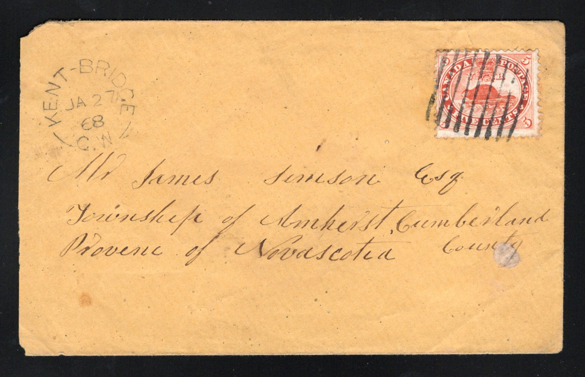 Inter-Provincial Cover, mailed on JAN.27.1868 (the ERD for this instrument, which was only used for about one year) to Nova Scotia, through Chatham (indistinct duplex transit), Montreal Post Office / C.E. (JAN.?? double circle transit) and