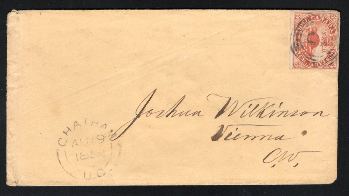 with 4-Ring #8 from Chatham U.C. mailed on AUG.19.1858 (Chatham double broken circle) to Vienna C.W. (AUG.20 receiver) through Ingersoll (AUG.20 transit), franked with a 3d red Beaver imperforate (3 margins, showing part of next stamp at bottom)