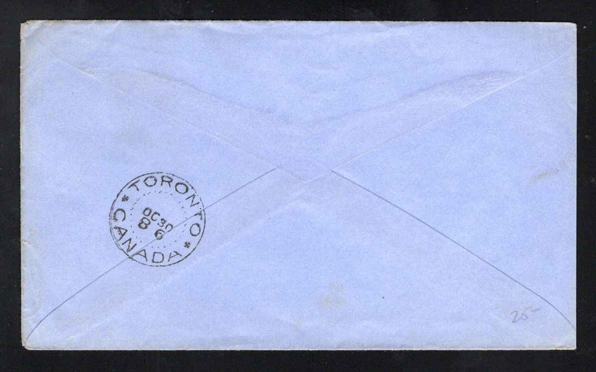 Toronto Postmarks on a Small Queen Cover, a blue "Canadian Home Circles" cover mailed from Toronto West Branch Office on OCT.30.1886 (second hammer of the duplex, used for only 8 months) to Selkirk Ont, with a scarce Toronto scarifying