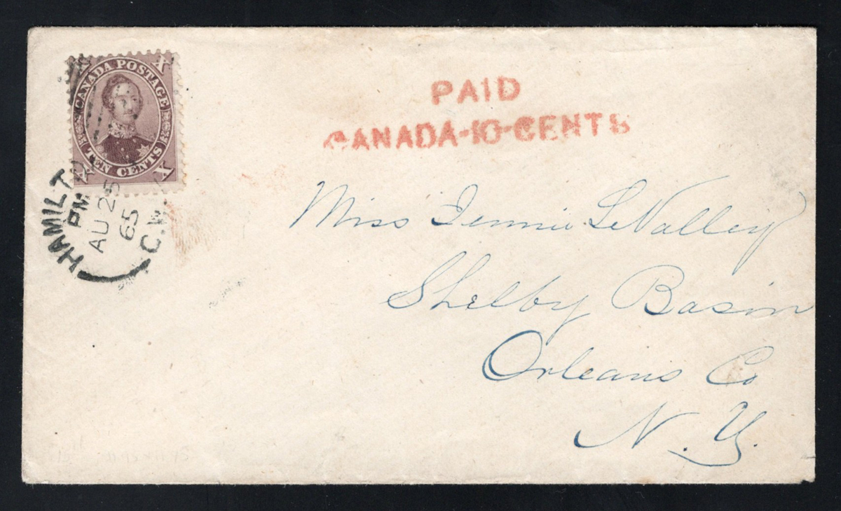 Hamilton Cross Border Cover, mailed on AUG.25.1865 (Berri duplex ties stamp) to Shelby Basin, New York, franked with a 10c Consort, also a "PAID / CANADA-10-CENTS" two line handstamp in red, applied in Hamilton. Very fine.