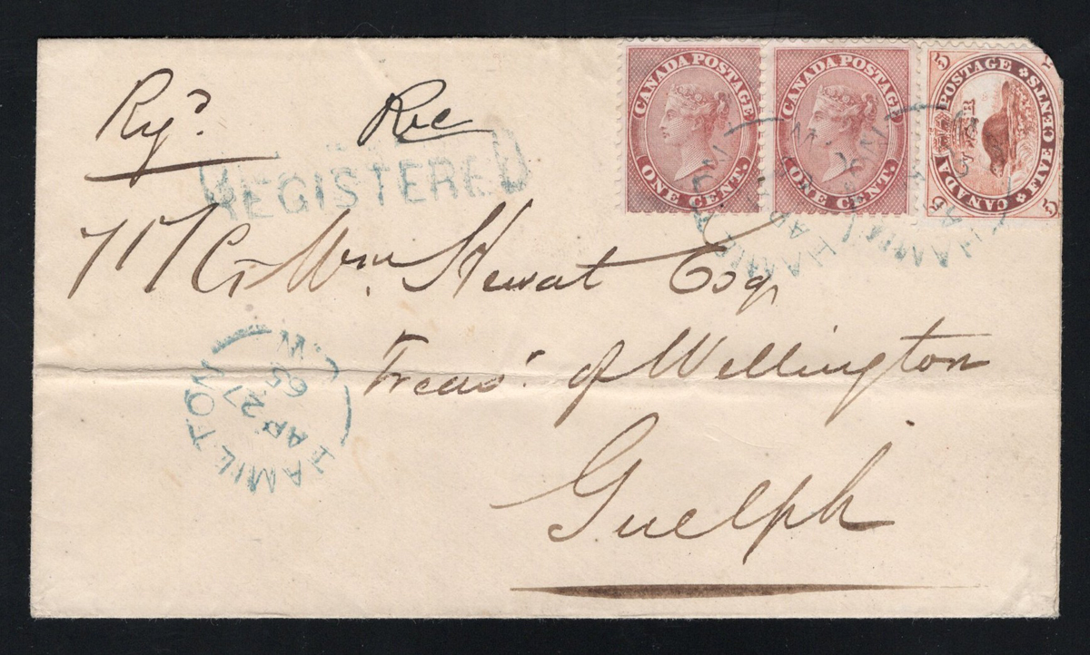 Broken Circle on Registered Cover, mailed on APR.27.1865 using the "C.W." broken circle in blue (the earliest recorded example of this, or any Hamilton broken circles) to Guelph (next day receiver on back). The cover is franked with a 5c Beaver