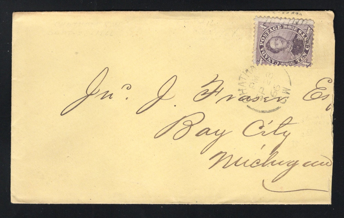 Rate Cover with 4-Ring #8 Cancels, mailed on SEP.9.1864 (Chatham double broken circle) to Toronto, with only part of a "1864 / C.W." postmark on back. Franked with a 5c Beaver and a vertical pair of the 10c brown Consort, all tied by three very
