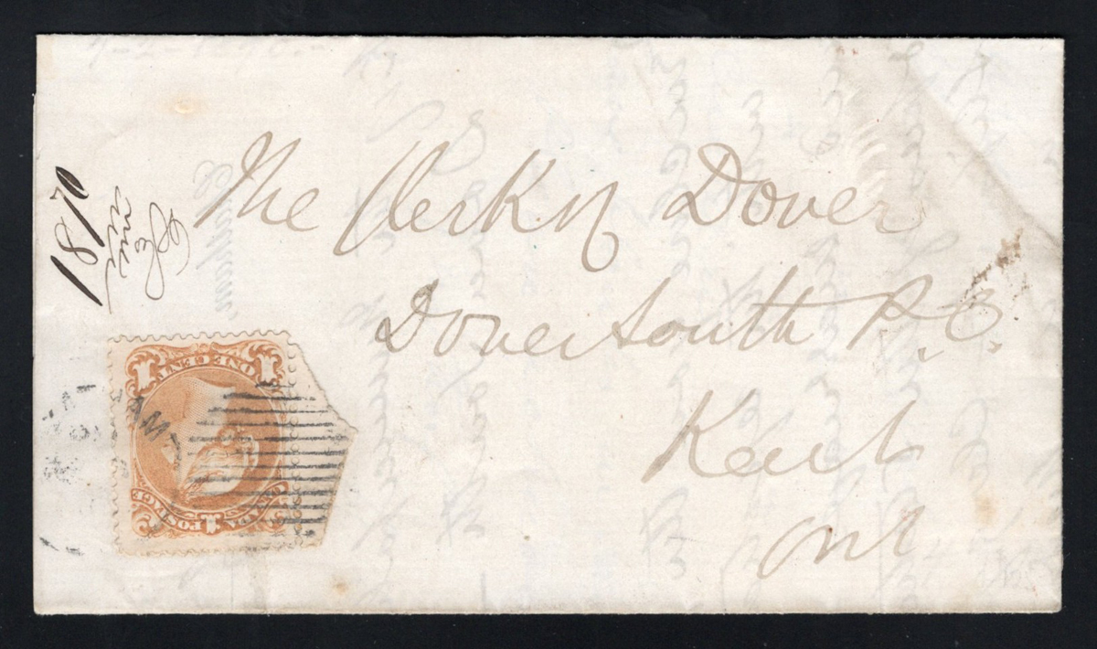 Folded Letter to Dover South C.W., mailed FEB.2.1870 (based on letter inside) to Dover South (Kent Co.) with a FEB.6.1870 broken circle receiver on back (the only recorded example of this postmark). Franked with a 1c Yellow Orange Large Queen