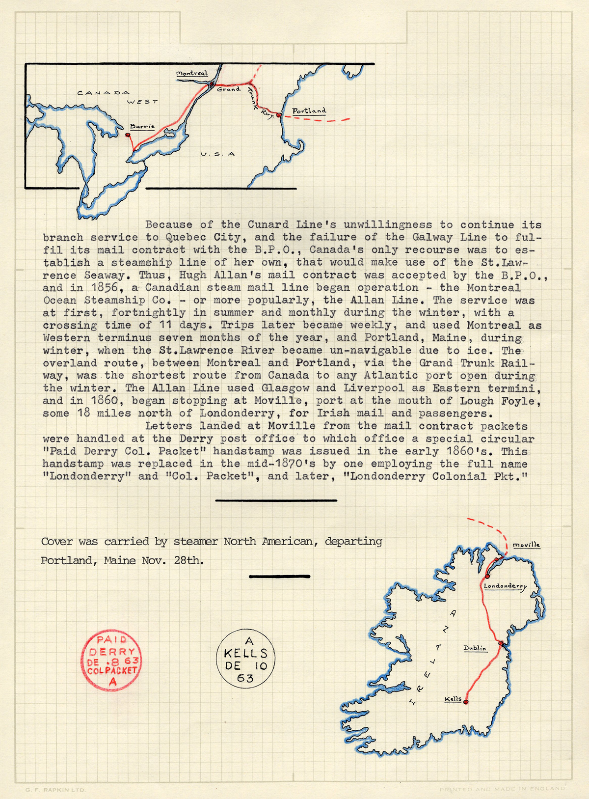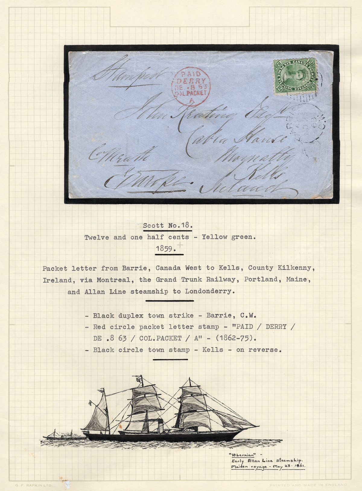 Victoria on Cover from Canada to Ireland, mailed from Barrie C.W. on NOV.25.1863 (duplex ties stamp) to Kells, Ireland (DEC.10.1863 receiver) via “PAID / DERRY / DE 8 63 / COL.PACKET / A” c.d.s. in red. Franked with a 12½c green Queen Victoria