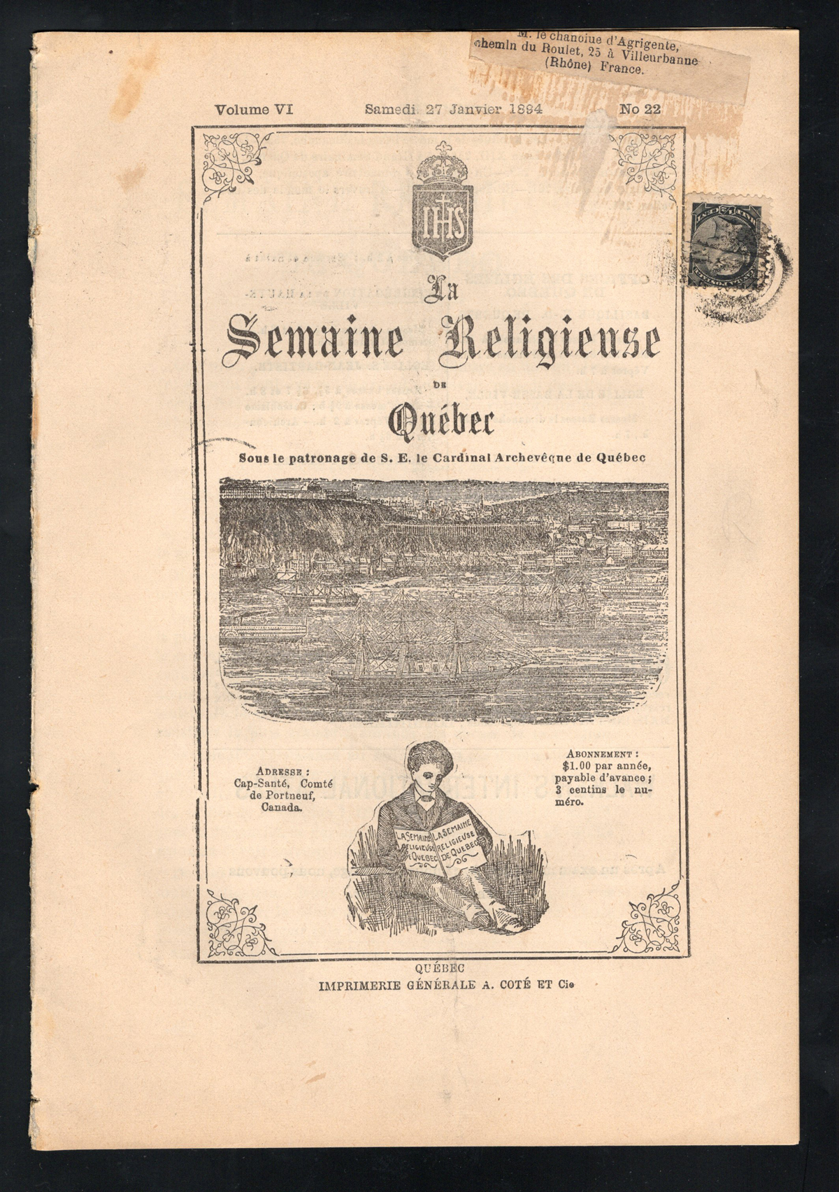 Complete Periodical to France, “La Semaine Religieuse de Québec” (16 pages) Volume VI, No. 23 is dated JAN.27.1894 and was mailed to Villeurbanne, France, with intact address label. Franking is by a single ½c Small Queen, tied by a blurry 2-ring