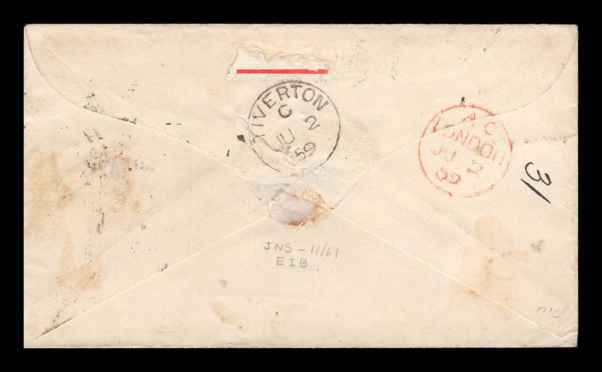 transit in red) and London (JUN.2.1859 transit in red), endorsed “Per Steamer Anglo Saxon” (which left too early, instead crossing on the “Indian”). The cover is franked with a 7½d green Queen Victoria imperforate, tied by a 4-ring numeral “21”