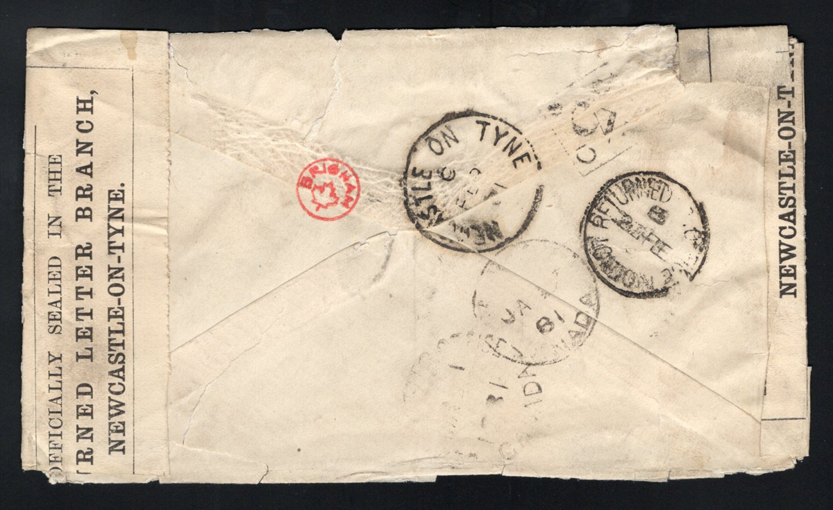 109 CVR 40 image1881 10c (Double Weight) Small Queen Cover to England, Undeliverable, mailed from Chatham, Ontario sometime in 1881 (duplex year is unreadable) to Newcastle on Tyne (FEB.9.1881 receiver on back), through Halifax (JAN.27.1881), franked with a very fine 10c dull rose lilac Small Queen, paying the double weight 5c rate. Upon arrival, the cover was endorsed "Not Known" and "Address Insufficient" in bright purple ink. It was sent to the Newcastle on Tyne Dead Letter Office (FEB.21 datestamp on front), where it was opened, then resealed with "Officially sealed" labels. The cover was then mailed back to Canada (FEB.22 "Returned Office / London" c.d.s. on back) and arrived at the Ottawa Dead Letter Office on MAR.1.1881. Condition is commiserate with an officially repaired cover, and we do not recall seeing another undeliverable cover at this rate. Ex Bowen ("Ten" Auction, lot 2398), Brigham (July 2016 Auction, lot 533). (Scan 1) (Scan 2) (All Scans) (All Images)