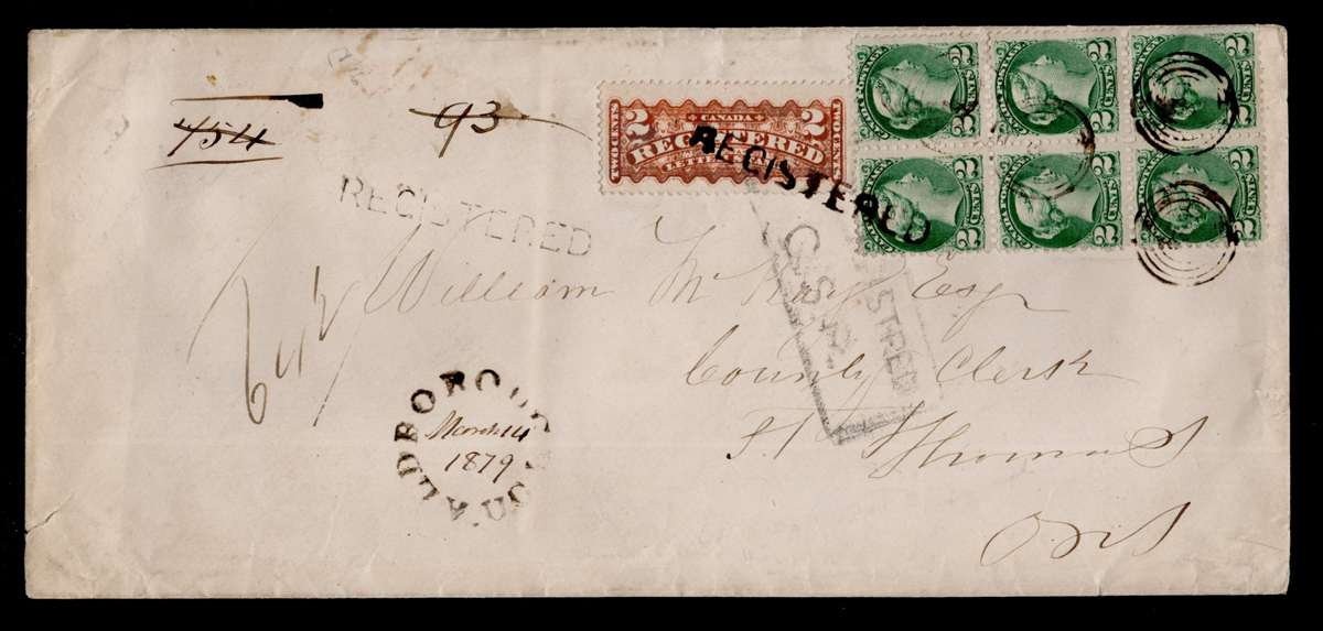 102 CVR 36, F1 image1879 Aldborough U.C Quadruple Rate Registered Cover, mailed on MAR.14.1879 (28mm steel datestamp was part of the 1831 order, and this is a LRD by 17 years) to St Thomas (MAR.15 receiver) and travelled on the Canada Southern Railway (boxed "REGISTERED / C.S.R." RY-33, and "C.A.SOUTHERN.R / EAST" double broken circle dated MAR.15 RY-34). The cover is franked with a 2c green Small Queen block of six, plus a 2c orange Registration issue, all tied by concentric ring cancels and straightline "REGISTERED" handstamps. Small tear at left, else a very fine quadruple rate registered cover and scarce railway postmarks. Ex Harrison, Averbeck. (Scan 1) (Scan 2) (All Scans) (All Images)