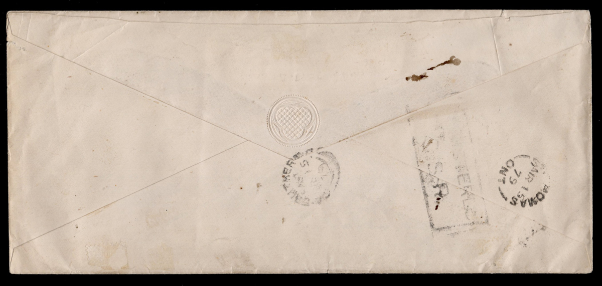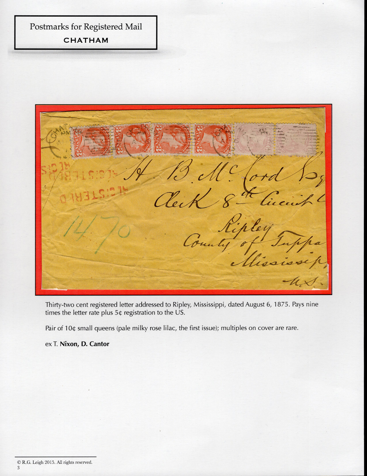 107 CVR 37e, 40e image1875 32c Rate Registered Cover to the United States, mailed from Chatham, Ontario on AUG.6.1875 (Berri duplex strikes cancel the stamps) to Ripley, Mississippi, with partial AUG.6 West G.W.R. datestamp on reverse. The cover is franked with four (two singles and a pair) 3c red Small Queens (perf. 11½ x 12) plus a vertical pair of the 10c pale milky rose lilac Small Queens (perf 11½ x 12) paying 32c, being 9 times the cross-border letter rate plus 5c registration fee. Reduced at both ends and wrinkling, which is to be expected on such a heavy cover, still an unusual rate and more importantly a scarce and desirable use of the first printing of the 10c value, as very few multiples of this issue are known, on or off cover. Ex Ted Nixon (2012), Danny Cantor (2015).