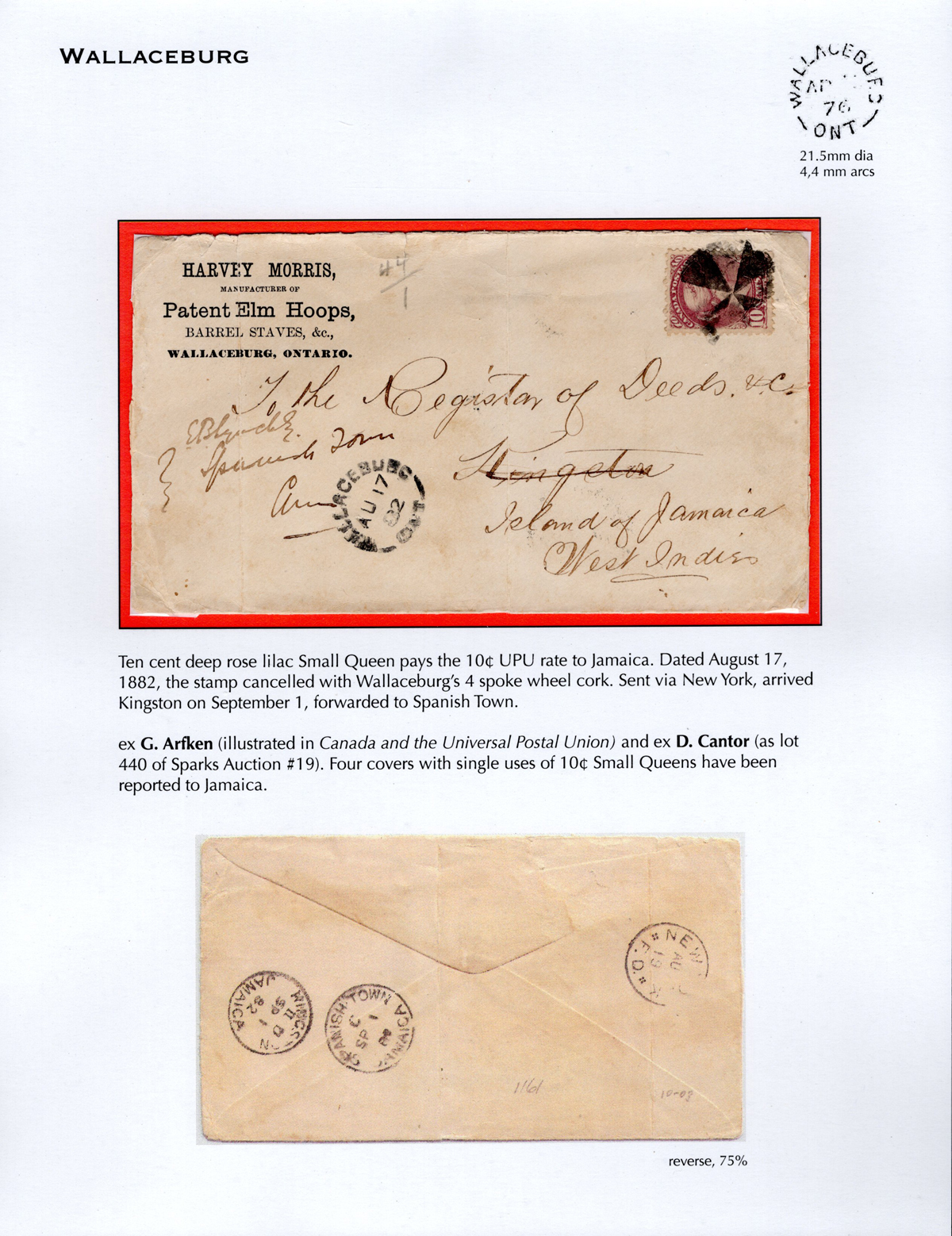 110 CVR 40b image1882 10c UPU Small Queen Cover to Jamaica, mailed from Wallaceburg on AUG.17.1882 to Kingston, Island of Jamaica, West Indies (SEP.1 receiver) via New York, redirected within Jamaica to Spanish Town (SEP.1 receiver). Franked with 10c deep rose lilac Small Queen, tied by a fancy propeller cork cancel, paying the 10c UPU double weight letter rate. Open on three sides, with vertical creases, piece of backflap missing and overall aging, still a scarce franking / destination, fine. Only four solo uses of the 10c value to Jamaica have been recorded. Ex Danny Cantor and George Arfken, and illustrated in "Canada and the Universal Postal Union" (p.26).