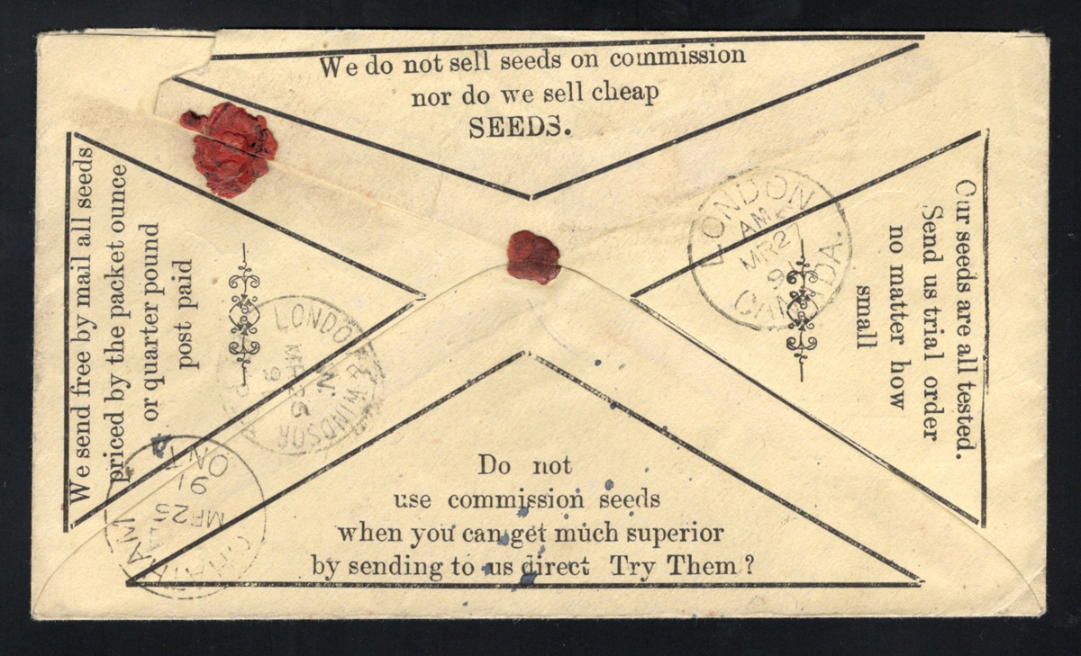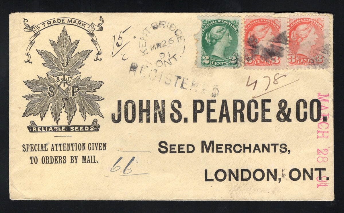 101 CVR 36, 41 image1891 Small Queen Registered Illustrated Cover, mailed from Kent Bridge, Ont. on MAR.26.1891 (very fine broken circle free strike, and earliest recorded strike of this instrument) to London, Ont. (MAR.27 receiver) through Chatham (MAR.26), via the London & Windsor RPO (MAR.26). The cover is franked with a pair of 3c and a single 2c Small Queens, paying the 8c registration rate. The front is illustrated with three Maple Leaves from the J.S.P & Co. Seeds, and the back has more advertising relating to seeds, such as for example "We do not sell seeds on commission nor do we sell cheap seeds". Very fine. (Scan 1) (Scan 2) (All Scans) (All Images)