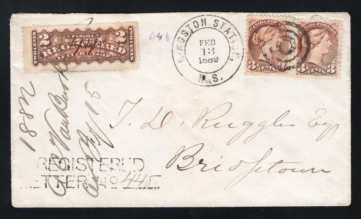 103 CVR 37, F1 image1882 Kingston Station N.S. Unofficial Duplex on a Registered Small Queen Cover, mailed on FEB.13.1882 (unofficial duplex # DUN-23) to Bridgetown, franked with two 3c Small Queens and a 2c Registration stamp (each a tad sulphuretted) paying the 8c registration letter rate. Also a "REGISTERED / LETTER No ___" handstamp. Very fine, and a scarce duplex cancel.