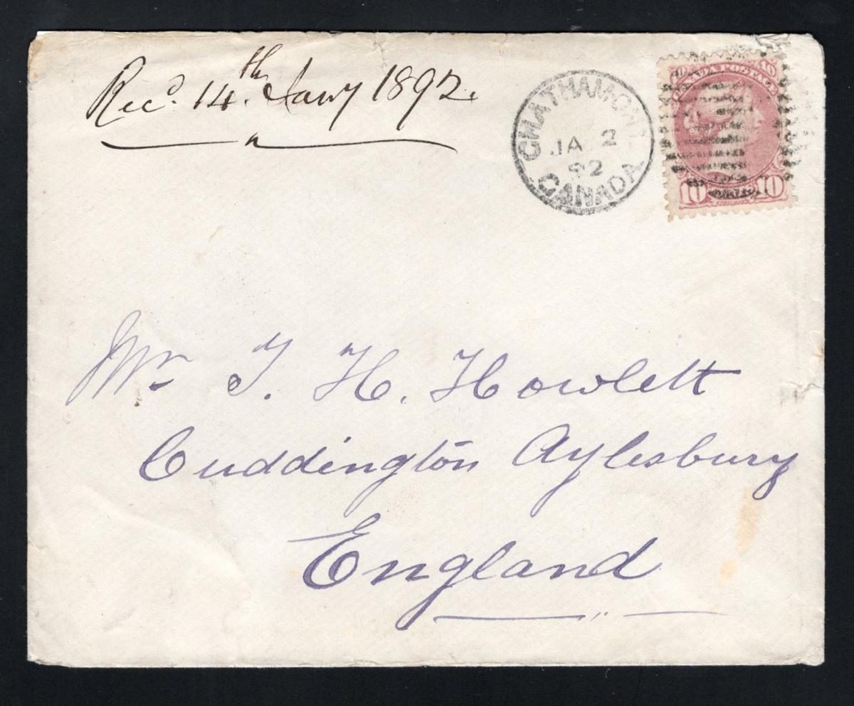 111 CVR 40b image1892 10c Small Queen Cover to England, mailed from Chatham, Ont on JAN.2.1892 (duplex ties stamp) to Aylesbury, England (JAN.14 receiver), franked with a very fine 10c deep rose lilac Small Queen (late use of an 1883-1884 Montréal printing). Overall fine.