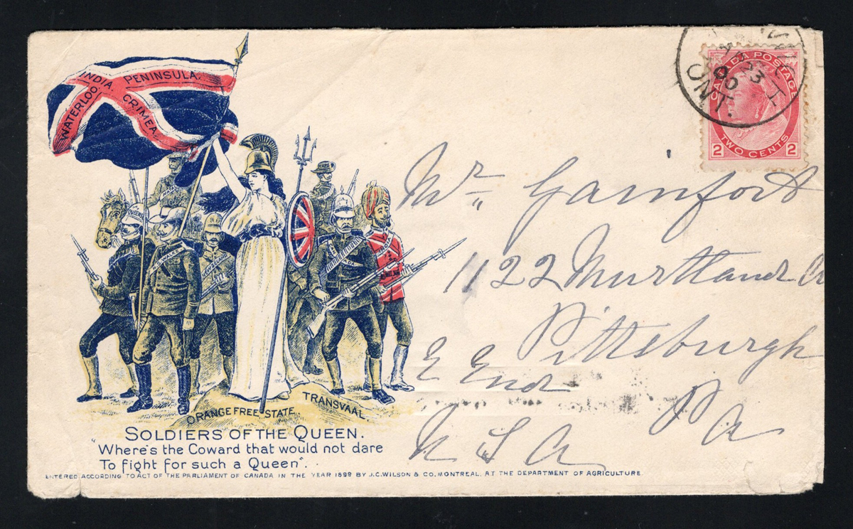 116 PC 77 image1900 "Soldiers of the Queen" J.C. Wilson Illustrated Cover, mailed from Sandwich, Ont on APR.23.1900 (c.d.s. ties stamp) to Pittsburgh, PA (partial APR.24 receiver) through Buffalo NY (APR.24). A colourfully illustrated 2c Numeral cover with small edge faults, still overall fine.