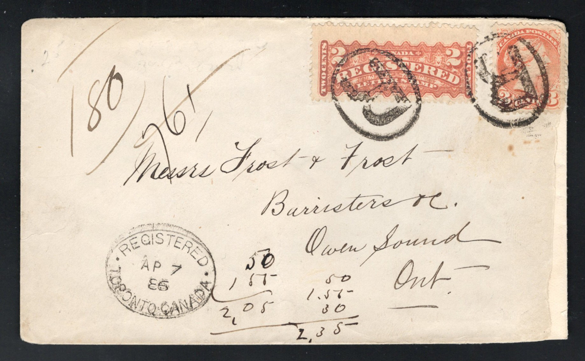104 CVR 37, F1 image1886 Toronto Registered Cover to Owen Sound, mailed on APR.7.1886 (three Toronto oval registration postmarks, one on front and two on back) to Owen Sound same day receiver on back. The cover is franked with a 3c Small Queen and a 2c Registration stamp, paying the 5c domestic registered cover rate. Bit reduced at right, still overall fine.