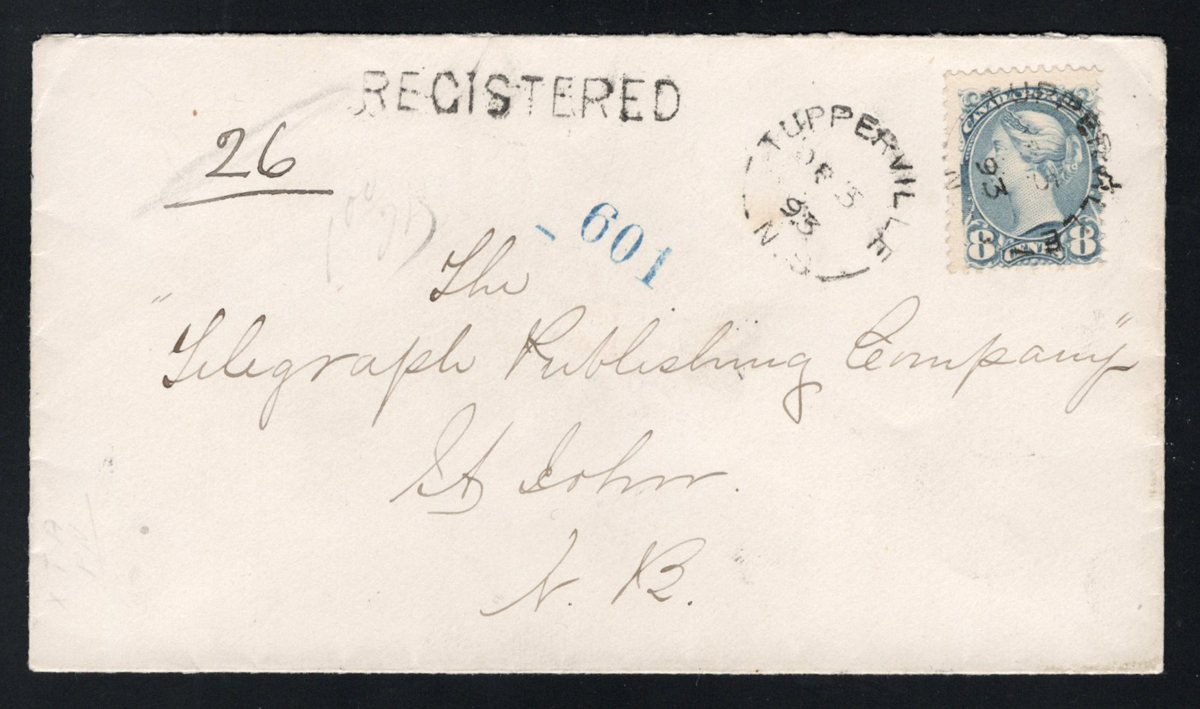 113 CVR 44a image1893 8c Small Queen on Registered Cover, mailed from Tupperville NS (DEC.3.1893) to St John NB (DEC.6 receiver) via the Halifax & Annapolis RPO (DEC.5). Franked with an early (first year) use of the 8c blue grey Small Queen, paying the proper domestic registration rate, very fine.