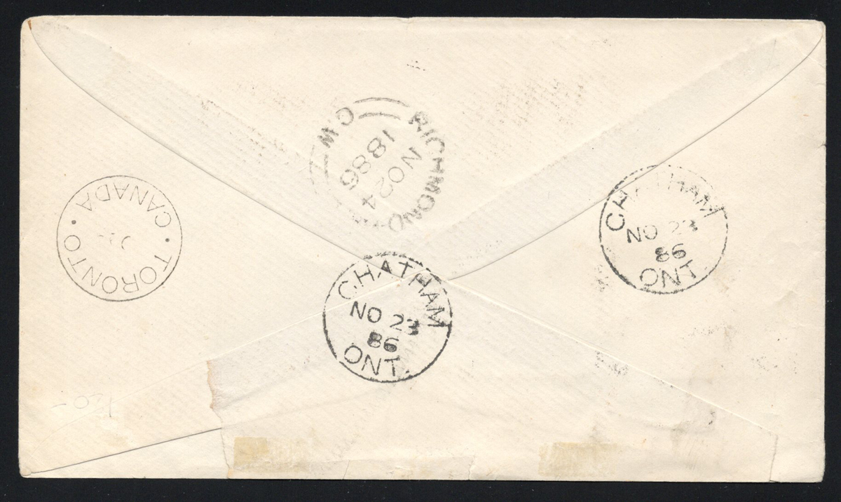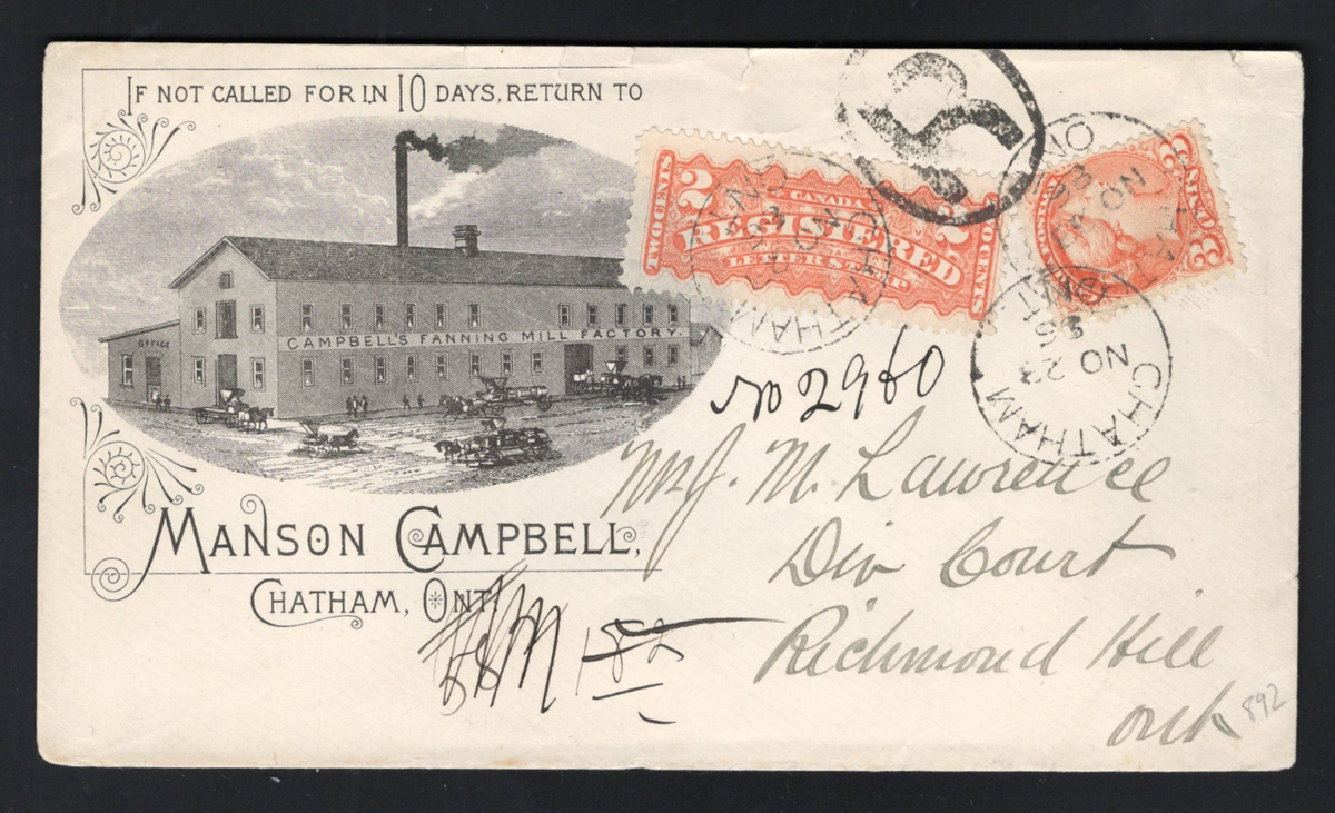 105 CVR 37, F1 image1886 Chatham Ont Registered Small Queen Illustrated Cover, mailed on NOV.23.1886 (two c.d.s. tie stamps) to Richmond Hill Ont (NOV.24 receiver) through Toronto (interesting dateless c.d.s.). An advertising cover from Manson Campbell Fanning Mills (showing their large building) franked with a 3c Small Queen and 2c Registration issues, very fine. (Scan 1) (Scan 2) (All Scans) (All Images)