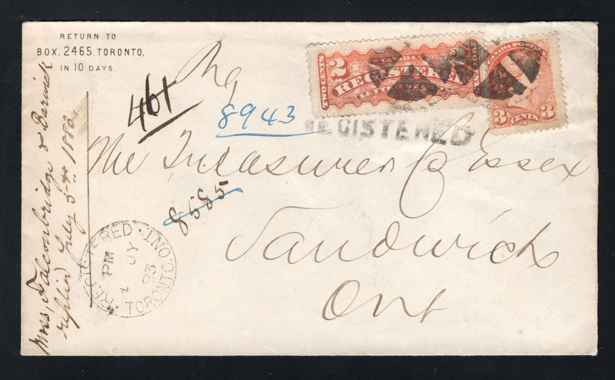 106 CVR 37, F1 image1883 Toronto Registered Small Queen Cover, mailed on JUL.4.1883 (scarce REGISTERED / TORONTO ONT c.d.s. free strikes on front and back) to Sandwich (JUL.5 receiver) through Windsor (JUL.5), franked with a 3c Small Queen and 2c Registration stamp, both tied by fancy cork cancels, very fine. Ex Horace Harrison (Lee, Sale 108, lot 234, where the Toronto postmark was described as having only 4 examples known on front).