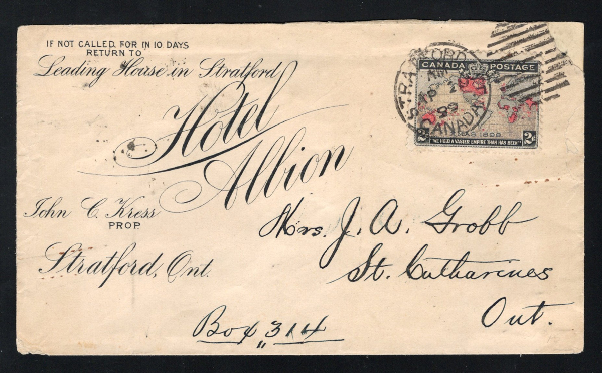 117 CVR 85 image1899 Hotel Albion 2c Map Cover, from the "Leading House in Stratford", mailed from Stratford on APR.20.1899 (duplex ties stamp) to St Catharines (same day receiver on back. Very fine and ex Brigham.