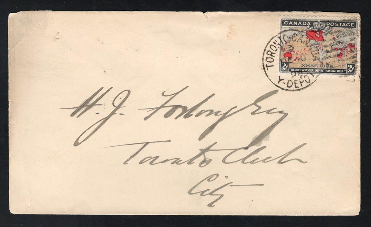 118 CVR 85 image1898 (Dec.10) 2c Map Early Use Cover, mailed on DEC.10.1898 (15 days before the official release date of Dec. 25) from Toronto Y-Depot (duplex ties stamp) to Toronto, franked with a 2c Map stamp paying the local drop letter rate. A few insignificant opening faults, still very fine.