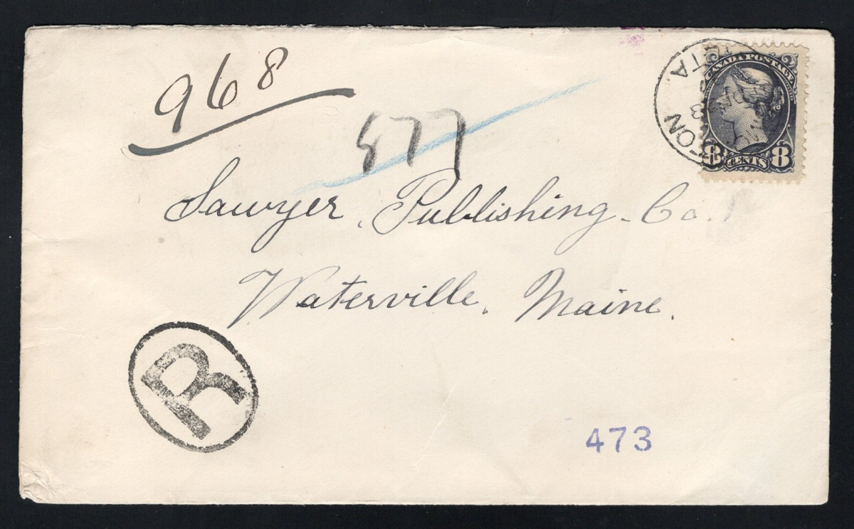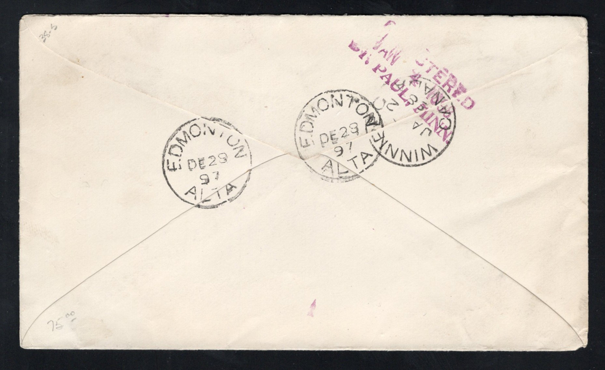 112 CVR 44 image1897 8c Small Queen on Registered Cross Border Cover, mailed from Edmonton, Alberta on DEC.29.1897 ( c.d.s. ties stamp, plus two other strikes on back) to Waterville, Maine, through Winnipeg (JAN.2.1898 transit) and St Paul, Minn. (JAN.4.1898 transit), franked with an 8c violet black Small Queen. A clean and very fine cover. (Scan 1) (Scan 2) (All Scans) (All Images)