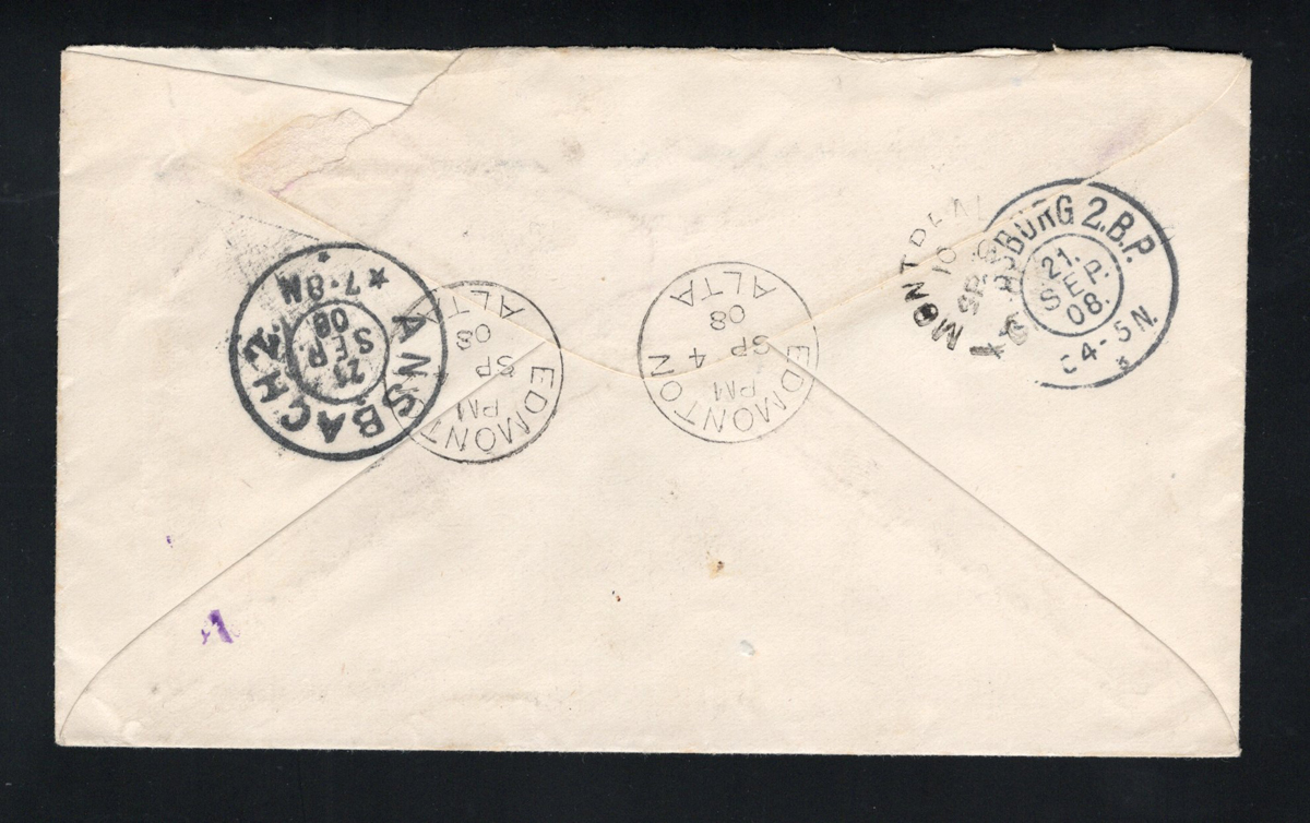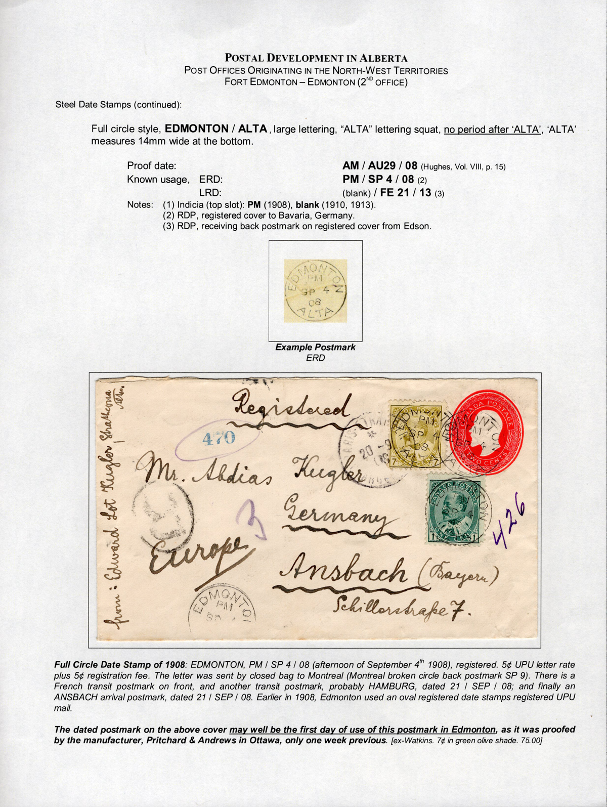 119 CVR 89, 92 image1908 Edmonton, Alberta Registered KEVII Cover to Germany, a 2c embossed KEVII stationery envelope mailed on SEP.4.1908 (six c.d.s. strikes front and back) to Ansbach, Germany (SEP.21 receiver) through Montréal (SEP.9), Paris France (SEP.20) and Hamburg, Germany (SEP.21). The cover is uprated with a 1c and a 7c KEVII issue totaling 10c. Very fine and mounted on an album page explaining that this may well be the ERD of the Edmonton c.d.s., as it had been proofed only 5 days prior. (Scan 1) (Scan 2) (All Scans) (All Images)