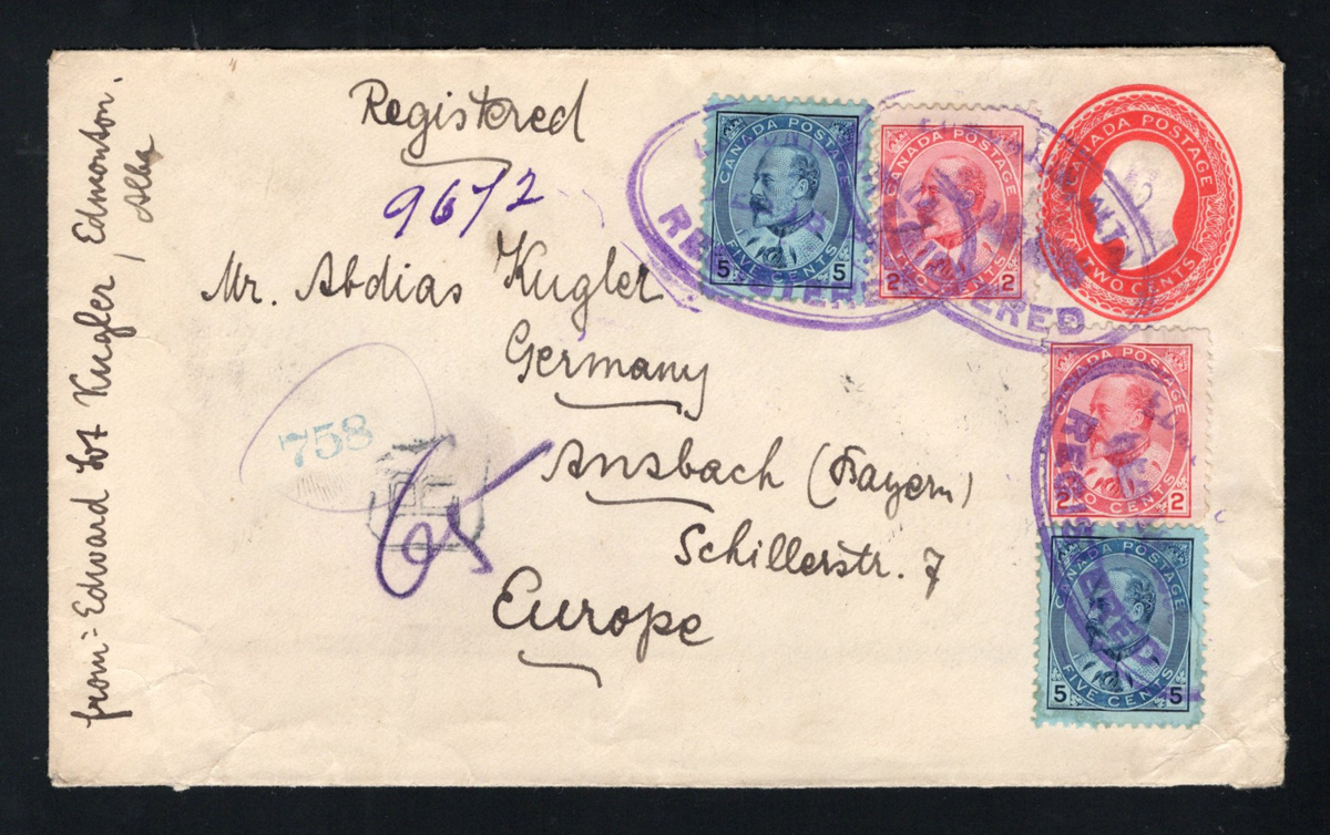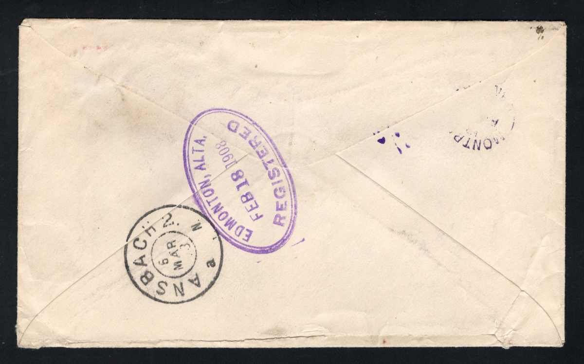 120 CVR 90, 91 image1908 Registered KEVII Cover Edmonton to Germany, an uprated 2c embossed KEVII stationery envelope mailed Edmonton on FEB.18.1908 (oval registration datestamps in purple) to Ansbach, Germany (MAR,.6 receiver on back). The cover is uprated with two 2c and two 5c KEVII issues, for a total of 16c. Very fine. (Scan 1) (Scan 2) (All Scans) (All Images)