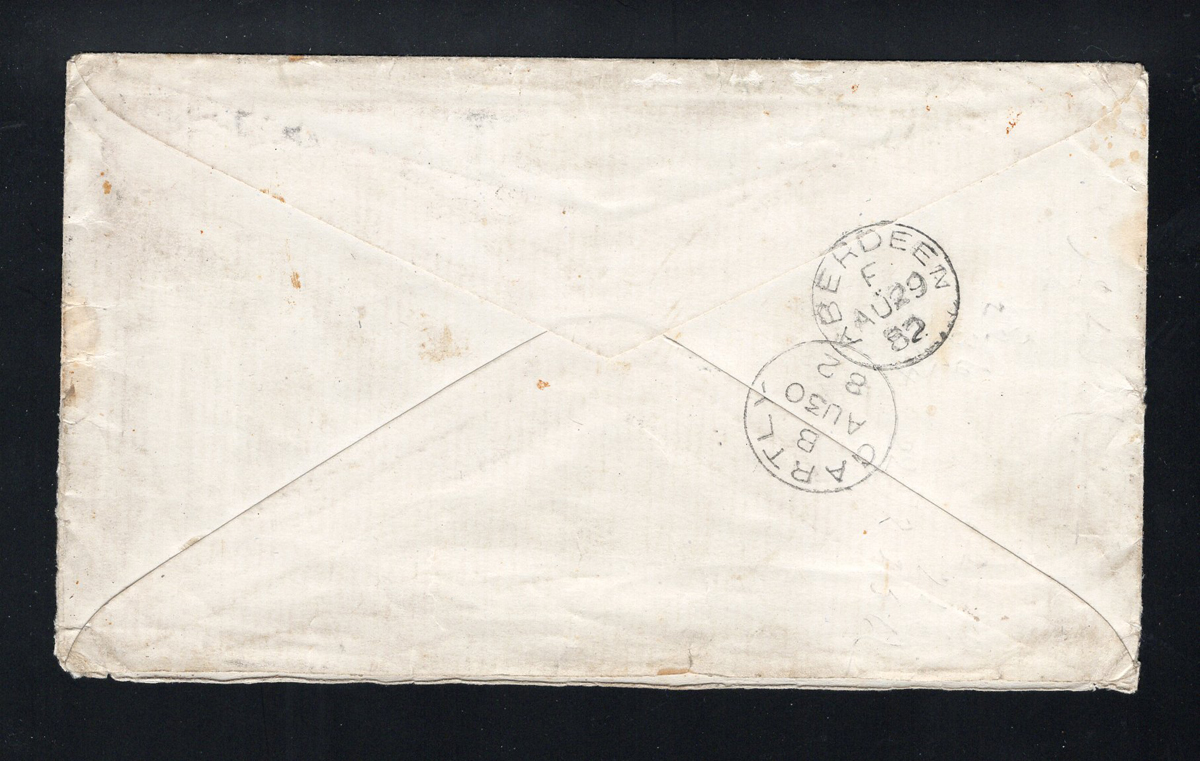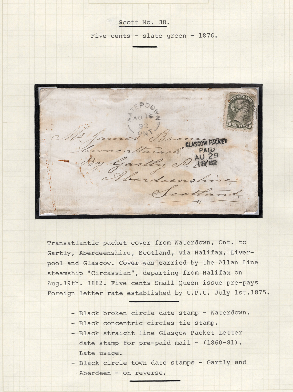 108 CVR 38 image1882 Cover from Waterdown, Ontario to Scotland, mailed on AUG.16.1882 (broken circle free-strike) to Gartly, Scotland, with “GLASGOW PACKET / PAID / AU 29 / 1882” transit handstamp, through Aberdeen (AUG.29 transit) and Gartly (AUG.30 receiver). Franked with a 5c Small Queen (Scott #38), tied by a concentric ring cancel. Staining and edge wear, else overall fine. (Scan 1) (Scan 2) (All Scans) (All Images)