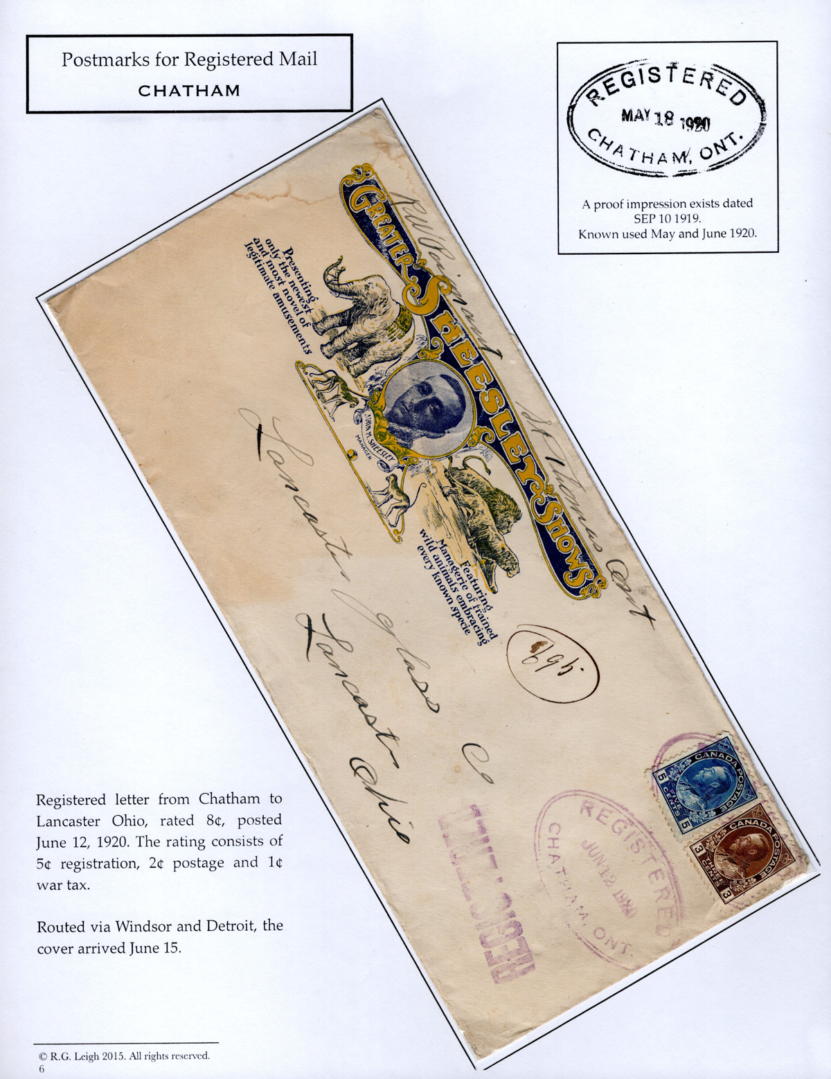 123 CVR 108, 111 image1920 Admiral Registered Illustrated Cover, mailed from Chatham, Ontario on JUN.12.1920 (oval registration datestamps in purple) to Lancaster, Michigan (JUN.15 receiver) through Windsor (JUN.12) and Detroit (JUN.12). The cover is illustrated in colour with several animals, etc from the Greater Sheesley Shows, animal trainers, etc. and is franked with a 5c + 3c Admiral issues. Bit of light staining at left, still an attractive cover.