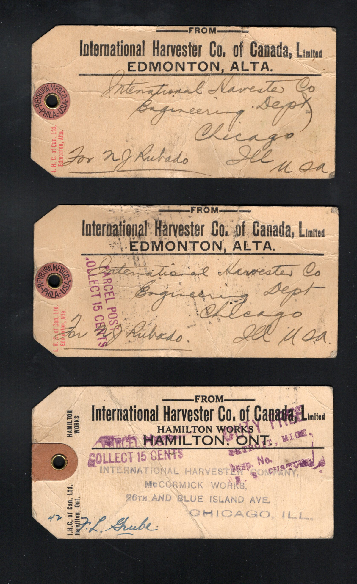 128 175/225 imageThree International Harvester Perfin Bag Tags, all three mailed from Edmonton, Alberta to Chicago, one is franked a total of 60c, second with 80c and third has 42c and was postage-dued 10c (5c and 10c US Dues) on arrival. All stamps (13 in all, with Scott #s 175, 190, 212, 225) have the International Harvester perfin. Some faults related to the nature of bag tags, still a pretty and scarce group. (Scan 1) (Scan 2) (All Scans) (All Images)