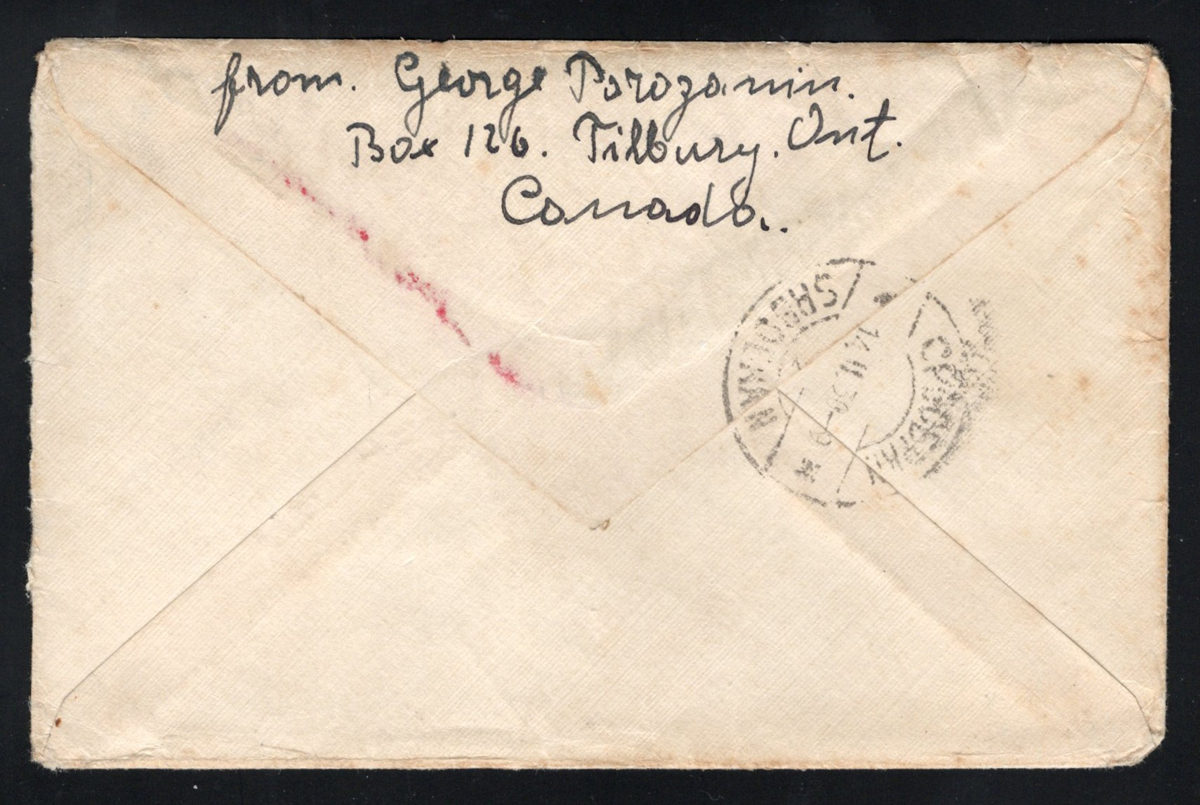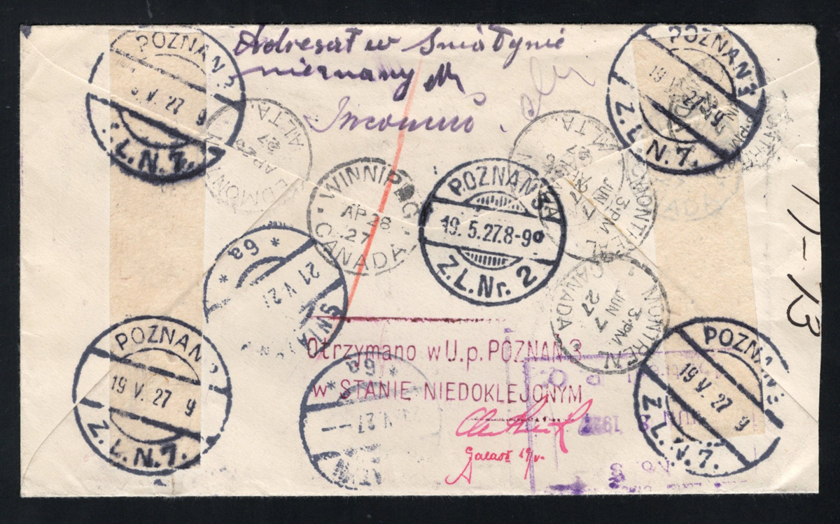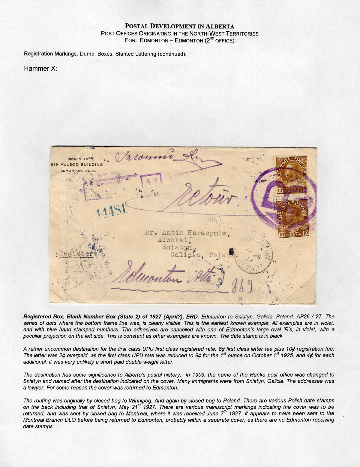 124 CVR 118 image1927 Edmonton, Alberta Registered Admiral Cover to Poland, mailed on APR.26.1927 (c.d.s. cancels front and back) to Sharyn, Galicia, Poland (MAY.21 receiver) through Winnipeg (APR.28) and Poznan, Poland (MAY.19). Back of cover shows a hand stamp in Polish “received in unsealed condition”, with two re-sealing tapes applied. There is also an “inconnu” manuscript notation on front and back which explains why it was received back in Montréal on JUN.7 (c.d.s.) with a partial "Montreal Dead Letter Office" handstamp where it was probably sent back to Edmonton in a closed bag. The cover is franked with two 10c Admirals overpaying the 8c + 10c registration rate by 2c (the UPU rate had recently been reduced to 8c on OCT.1.1925). Very fine and interesting. (Scan 1) (Scan 2) (All Scans) (All Images)