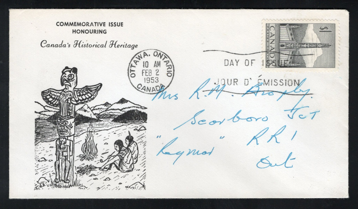 137 CVR 321 image1953 (Feb.2) $1 Totem Pole First Day Cover, addressed to Scarboro Junction, with private cachet, clean and very fine.