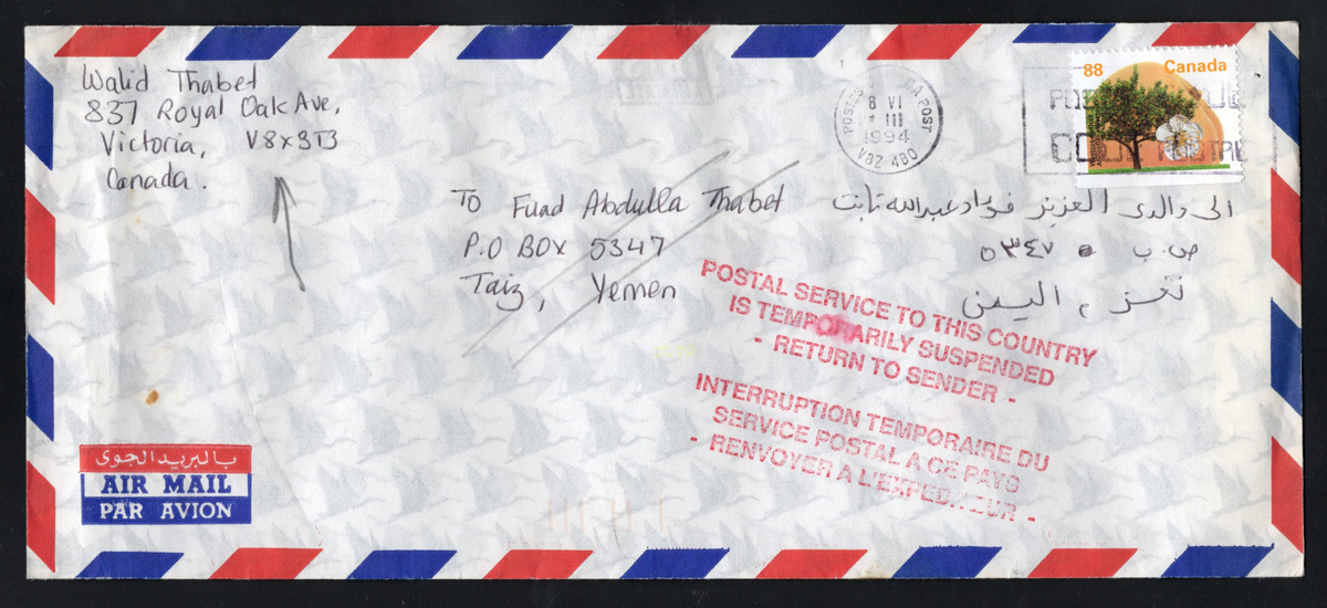 135 CVR 1373 image1993 88c Westcot Apricot on Undliverable Cover to Yemen, a legal size, airmail envelope mailed from Victoria, BC on JUN.8.1994 to Taiz, Yemen, showing a 6-line bilingual "Postal Service to this Country / is Temporarily Suspended / Return to Sender" (followed by French message) with an arrow pointing to the return address, very fine. A very interesting way to show the 88c Fruit Tree issue usage.