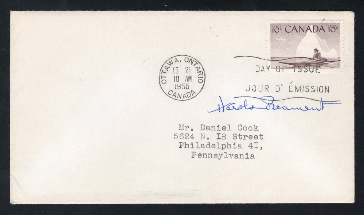 138 CVR 351 image1955 (Feb.21) 10c Inuk and Cayak First Day Cover Signed by Designer, Herold Beament, mailed from Ottawa to Pennsylvania, very fine.