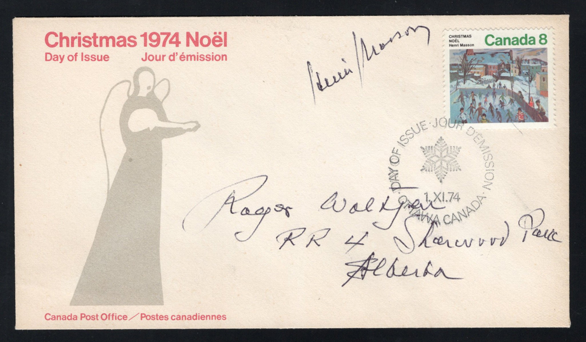 139 CVR 651 image1974 (Nov.1) 8c Skaters in Hull Christmas First Day Cover Signed by Original Painting Artist, the world renown painter Henri Masson, mailed from Ottawa to Sherwood, Park Alberta, very fine and scarce.
