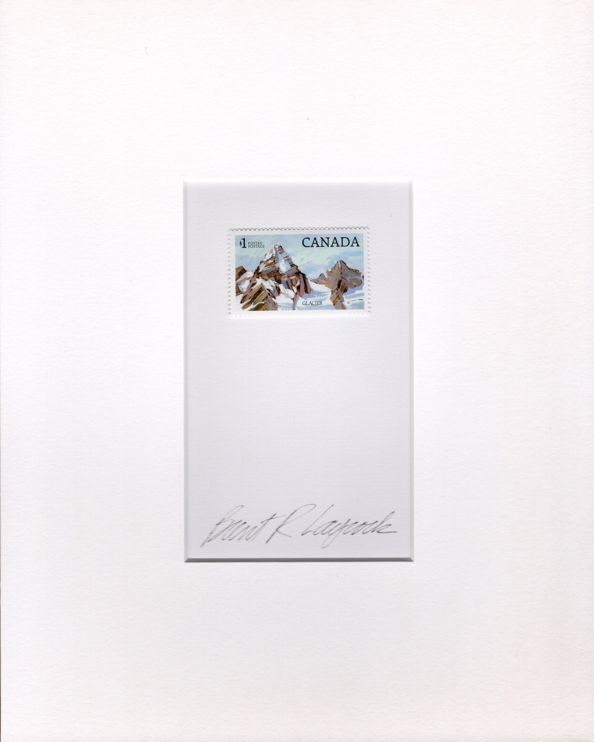134 og 934 image1984 $1 Glacier National Park Stamp Signed by Designer, a mint stamp mounted in a professional frame, signed below the stamp "Brent Laycock", very fine and would be a great addition to any Canadian stamp collection.