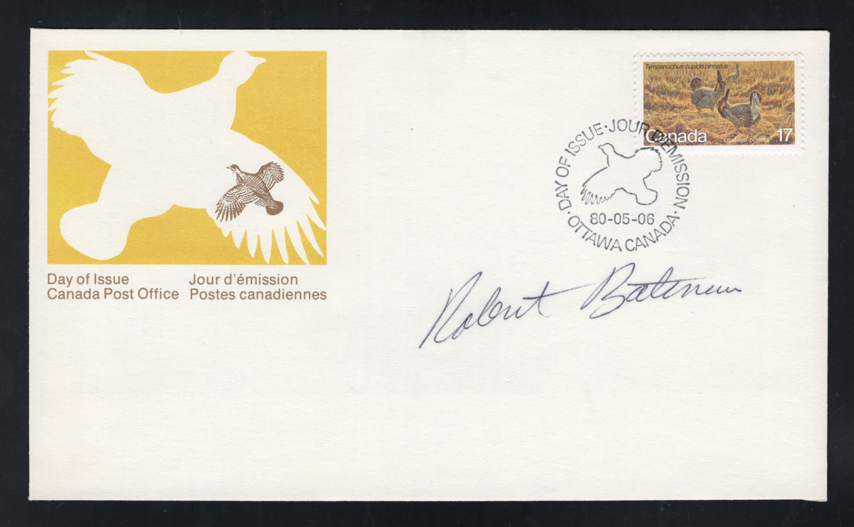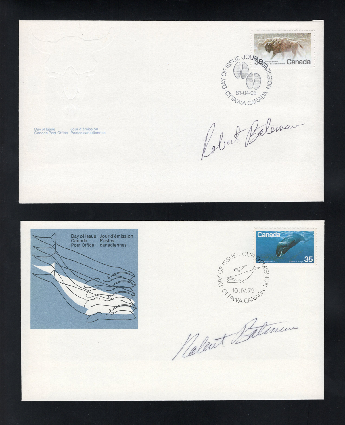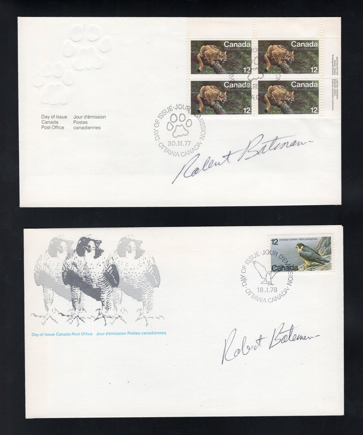 140 CVR 732/884 image1977-1981 Group of 5 Different First Day Covers Signed by their Designer, Robert Bateman. Includes #s 732 (12c Eastern Cougar plate block), 754 (12c Peregrine Falcon), 814 (35c Bowhead Whale), 854 (17c Prairie Chicken), 884 (35c Wood Bison), very fine. (Scan 1) (Scan 2) (Scan 3) (All Scans) (All Images)