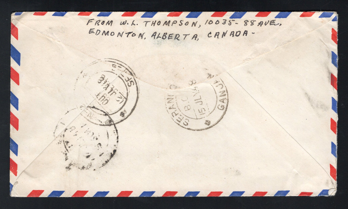 130 CVR 272 image1948 50c Logging on Calgary Stampede Cover to India, mailed from Calgary, with the special Exhibition Post Office cancel dated JUL.5.1948, with a Calgary Stampede cachet at left, addressed to Drissa India, with three Indian receivers dated JUL.12 and JUL.15. Very fine. (Scan 1) (Scan 2) (All Scans) (All Images)