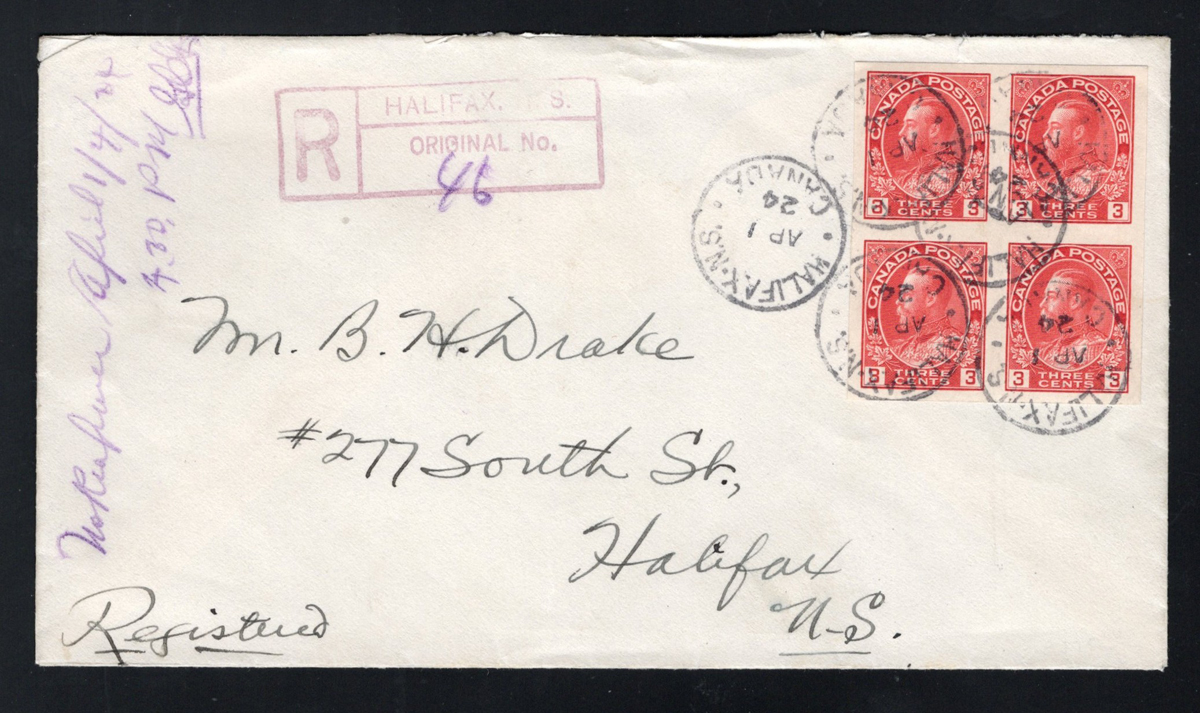 126 CVR 138 image1924 3c Admiral Imperforate Block on Registered Drop Cover, mailed to and from Halifax, NS on APR.1.1924 (c.d.s on front and back), franked with a very fine block of four of the 3c carmine Admiral issue, very fine...