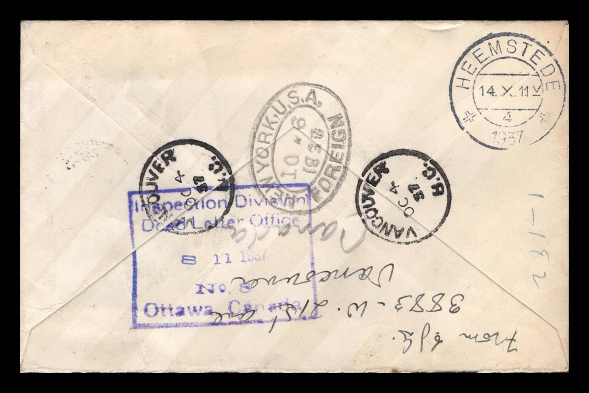129 CVR 225 image1937 Airmail Registered Cover Vancouver to Holland, Redirected, mailed on OCT.4.1937 (c.d.s. ties 20c Niagara Falls stamp) to Heemstede Holland through New York City (OCT.6), arrived at its destination on OCT.14, where the addressee, and his address were all crossed-out, with a "Delivery forbidden by / judicial sentence." handstamp in blue, as well as a local police circular handstamp, then sent to the Inspection Division / Dead Letter Office in Ottawa (NOV.8 receiver there). Very fine, and can't say we've seen too many of these! (Scan 1) (Scan 2) (All Scans) (All Images)