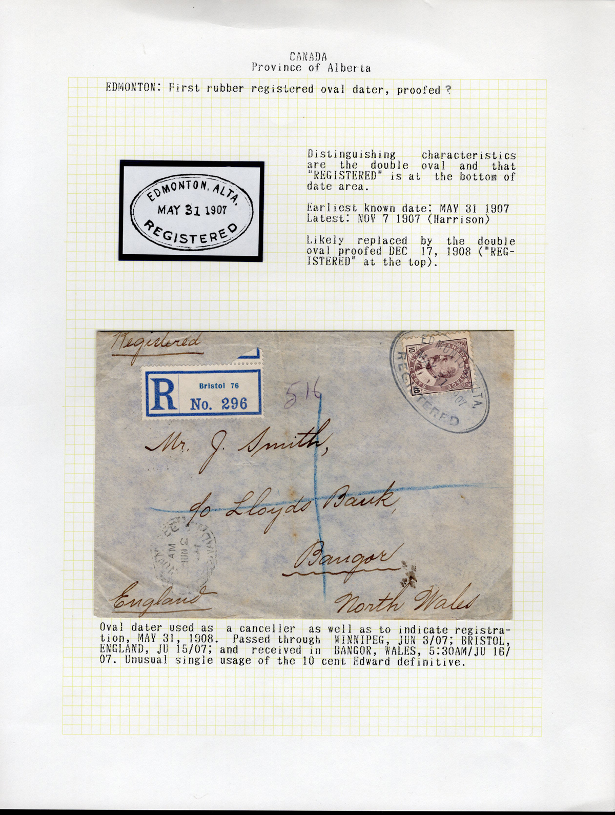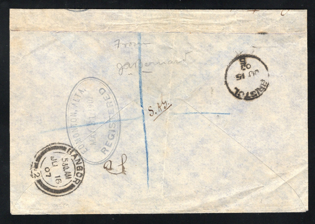 121 CVR 93 image1907 10c KEVII on Registered Cover to England, mailed from Edmonton, Alberta on MAY.31.1907 (oval registration date stamp ties stamp is the ERD) to Bangor, North Wales (JUN.16 receiver) through Winnipeg (partial JUN.3 c.d.s.) and Bristol (JUN.15 c.d.s.). Franked with a single 1c KEVII issue. Cover has a vertical crease and top has been folded over, else a fine appearing cover. (Scan 1) (Scan 2) (All Scans) (All Images)