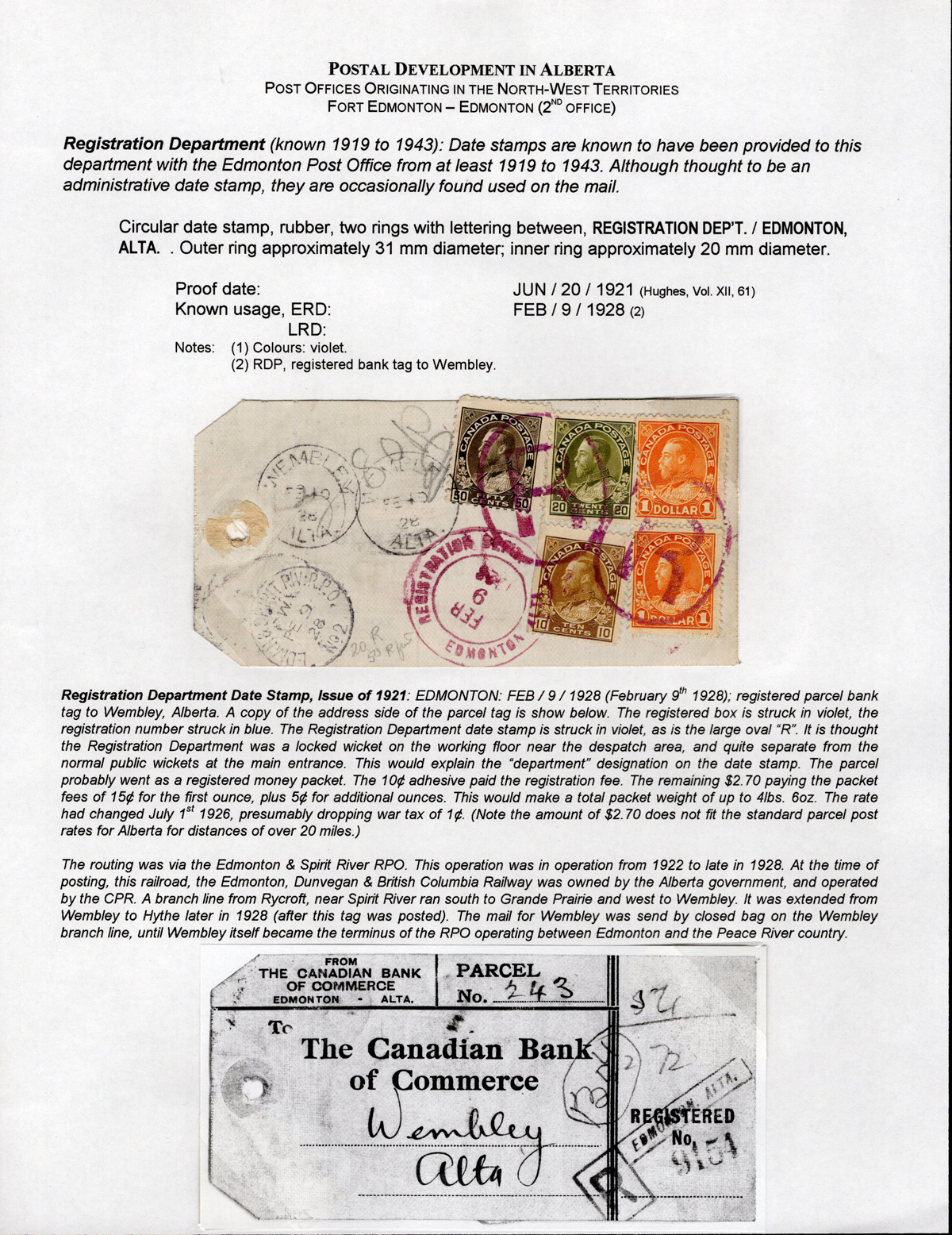 125 118-122 image1928 Registered Admiral Parcel Tag from Edmonton, Alberta, mailed Edmonton on FEB.9.1928 (double ring registration cancel in violet, plus boxed registration box on reverse) to the Canadian Bank of Commerce in Wembley, Alberta (DEB.10 receiver), via the Edmonton & Spirit River RPO (FEB.9 transit - this railway operated from 1922 to 1928 only). The tag is franked with a pair of $1 plus a single each of the 50c, 20c and 10c for a total of $2.80, very fine.